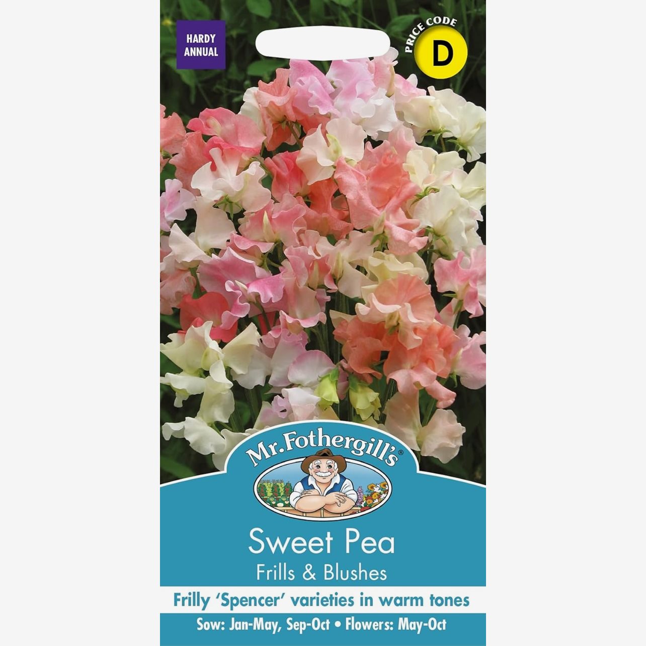 Luktärt Frills & Blushes är en dekorativ Spencertyp med tydligt vågiga blommor i varma nyanser av aprikos, krämvitt och rosa. Den passar utmärkt som snittblomma och är mycket vacker i blandbuketter. Sorten behöver växtstöd i form av spaljé, nät eller plank. För rikligare och längre blomning bör vissna blommor plockas bort regelbundet.
