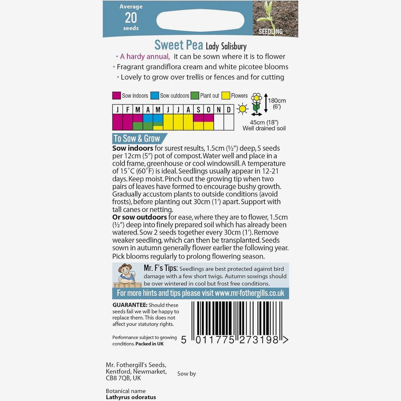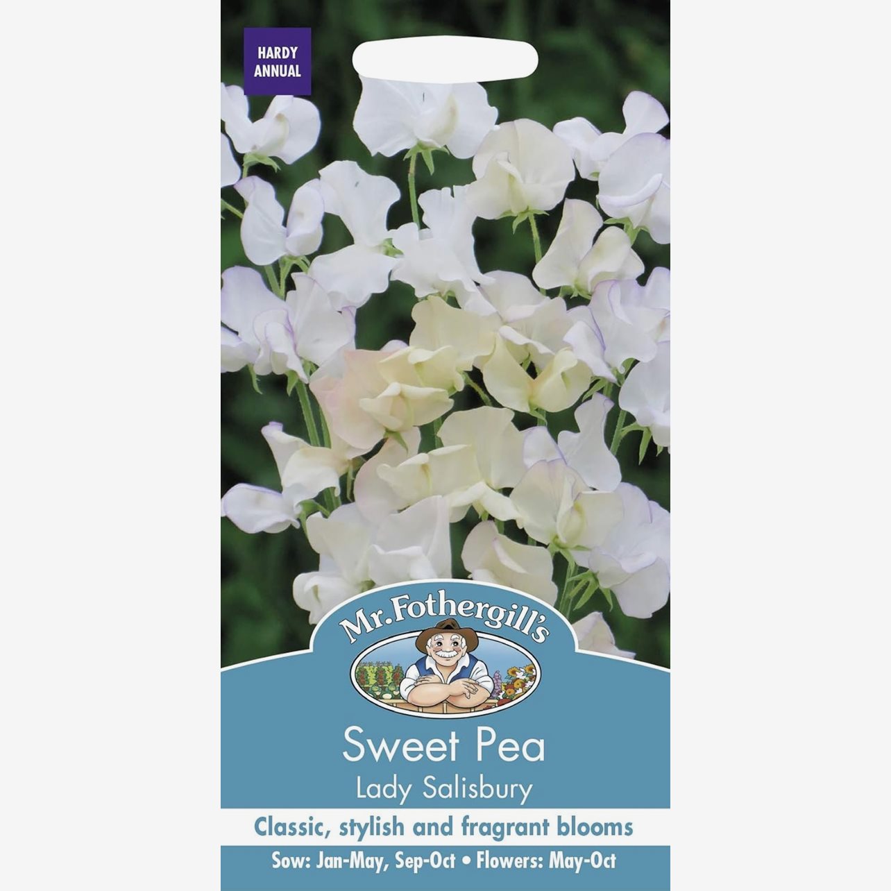 Luktärt Lady Salisbury är en väldoftande grandiflora-sort med krämvita blommor och fin picoteekant. Den är utmärkt att låta klättra över spaljé, staket eller nät och passar lika bra som snittblomma tack vare sina långa stjälkar och ljuvliga doft.