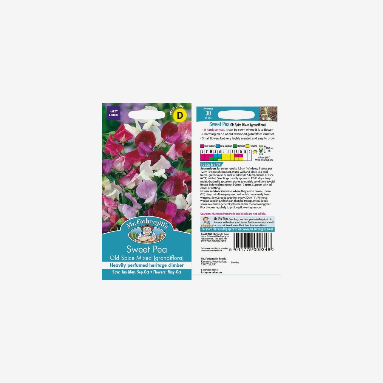 Odlingsanvisning: För bästa resultat förodlas luktärt Old Spice Mix inomhus från januari till mars. Så fröerna cirka 1,5 cm djupt, fem fröer per kruka, i fuktig såjord. Placera ljust och svalt, gärna i växthus, kallbänk eller på en sval fönsterbräda, vid cirka 15 °C. Håll jorden jämnt fuktig. Groning sker normalt inom 12–21 dagar. När plantorna har utvecklat två bladpar toppas de för att främja ett buskigare växtsätt. Avhärda plantorna noggrant och plantera ut i väldränerad jord från mars till maj med cirka 30 cm mellanrum. Ge stöd i form av höga käppar, spaljé eller nät.