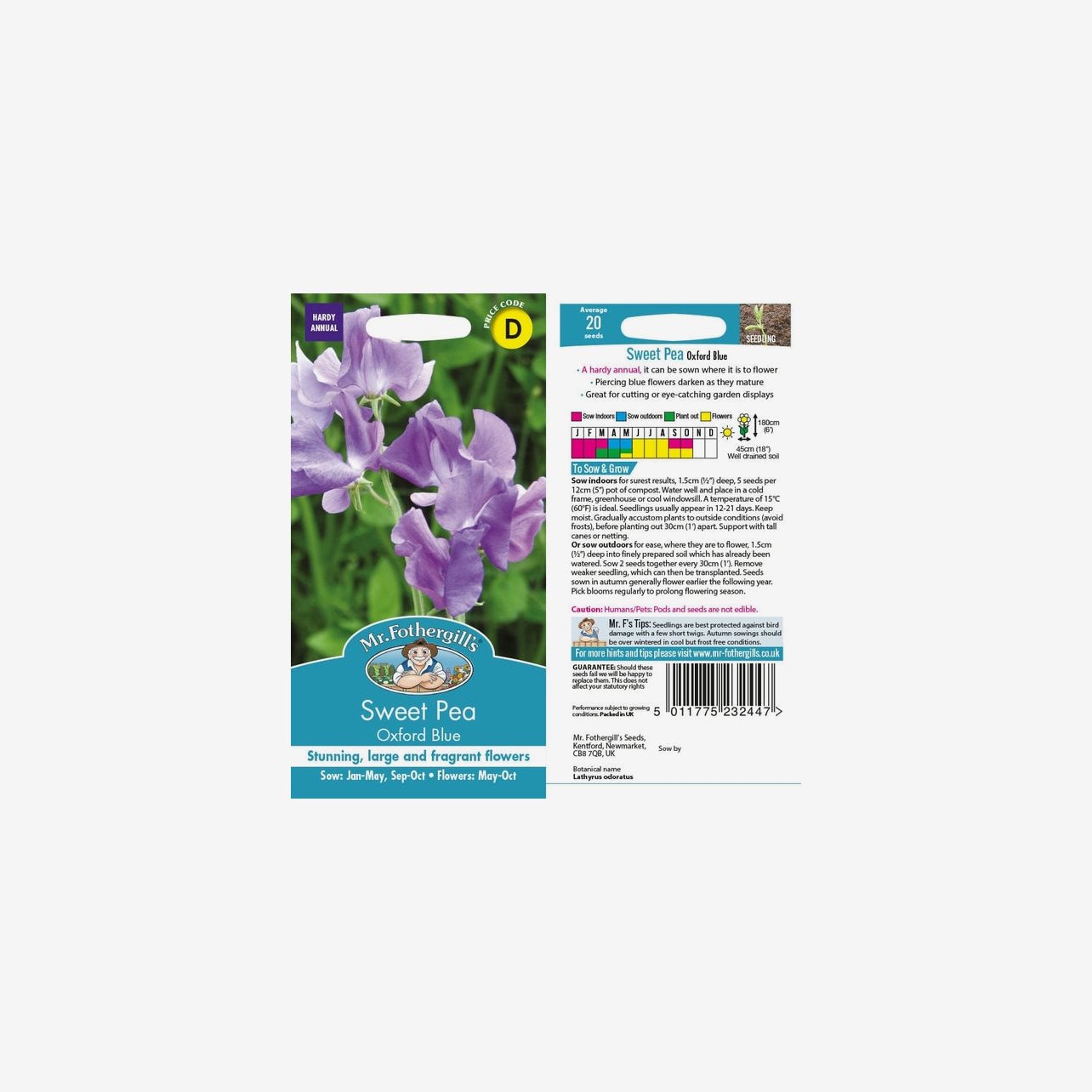 Odlingsanvisning: För bästa resultat förodlas luktärt Oxford Blue inomhus från januari till mars. Så fröerna cirka 1,5 cm djupt, fem fröer per kruka, i fuktig såjord. Placera ljust och svalt, gärna i växthus, kallbänk eller på en sval fönsterbräda, vid cirka 15 °C. Håll jorden jämnt fuktig. Groning sker normalt inom 12–21 dagar. När plantorna har utvecklat två bladpar toppas de för att främja ett buskigare växtsätt. Avhärda plantorna noggrant och plantera ut i väldränerad jord med cirka 30 cm mellanrum när frostrisken är över. Ge stadigt stöd i form av höga käppar, spaljé eller nät.