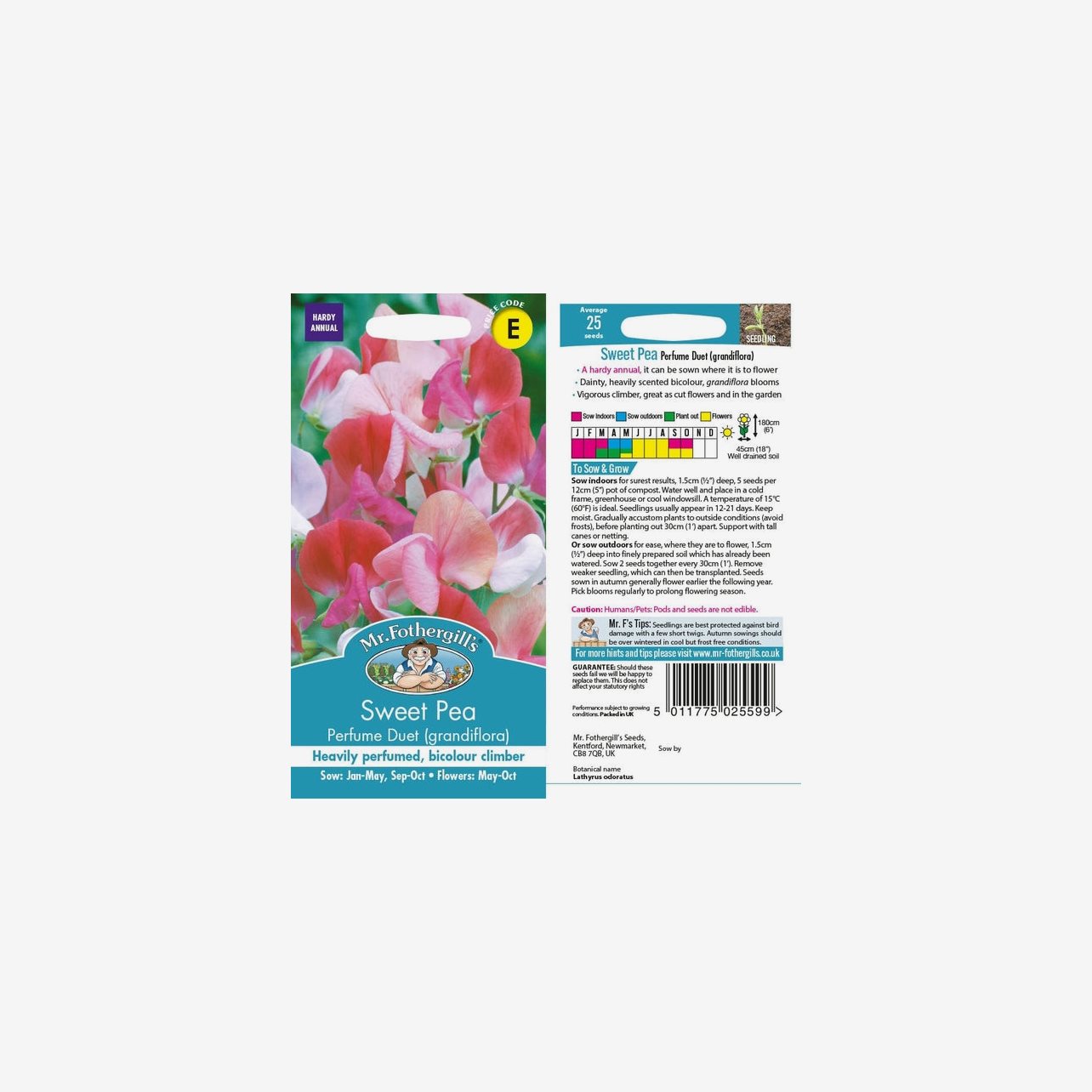 Odlingsanvisning: För bästa resultat förodlas luktärt Perfume Duet inomhus från januari till mars. Så fröerna cirka 1,5 cm djupt, fem fröer per kruka, i fuktig såjord. Placera ljust och svalt, gärna i växthus, kallbänk eller på en sval fönsterbräda, vid cirka 15 °C. Håll jorden jämnt fuktig. Groning sker normalt inom 12–21 dagar. När plantorna har utvecklat två bladpar toppas de för att främja ett buskigare växtsätt. Avhärda plantorna noggrant och plantera ut i väldränerad jord från mars till maj med cirka 30 cm mellanrum. Ge stadigt stöd i form av höga käppar, spaljé eller nät.