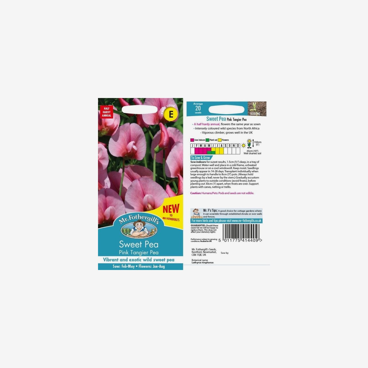 Odlingsanvisning: För säkrast resultat förodlas luktärt Pink Tangier inomhus. Så fröerna cirka 1,5 cm djupt i fuktig såjord i tråg eller kruka. Placera svalt och ljust, gärna i kallbänk, ouppvärmt växthus eller på en sval fönsterbräda. Håll jorden jämnt fuktig. Groning sker normalt inom 14–28 dagar. Plantera om plantorna i separata krukor när de är stora nog att hanteras och undvik att hålla i stammen – greppa alltid plantorna i ett blad. Avhärda plantorna noggrant och plantera ut med cirka 30 cm mellanrum när frostrisken är helt över. Ge stadigt stöd i form av käppar, nät eller spaljé.