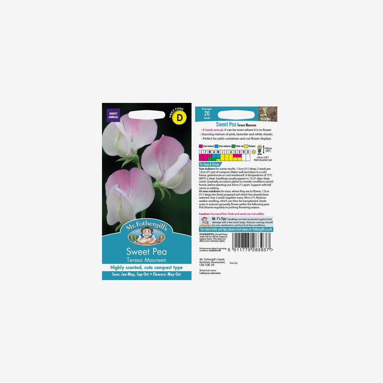 Odlingsanvisning: För säkrast resultat förodlas luktärt Teresa Maureen inomhus från januari till mars. Så fröerna cirka 1,5 cm djupt, fem fröer per kruka, i fuktig såjord. Placera ljust och svalt, gärna i växthus, kallbänk eller på en sval fönsterbräda, vid cirka 15 °C. Håll jorden jämnt fuktig. Groning sker normalt inom 12–21 dagar. När plantorna har utvecklat två bladpar toppas de för att främja ett buskigare växtsätt. Avhärda plantorna noggrant och plantera ut med cirka 30 cm mellanrum när frostrisken är över.