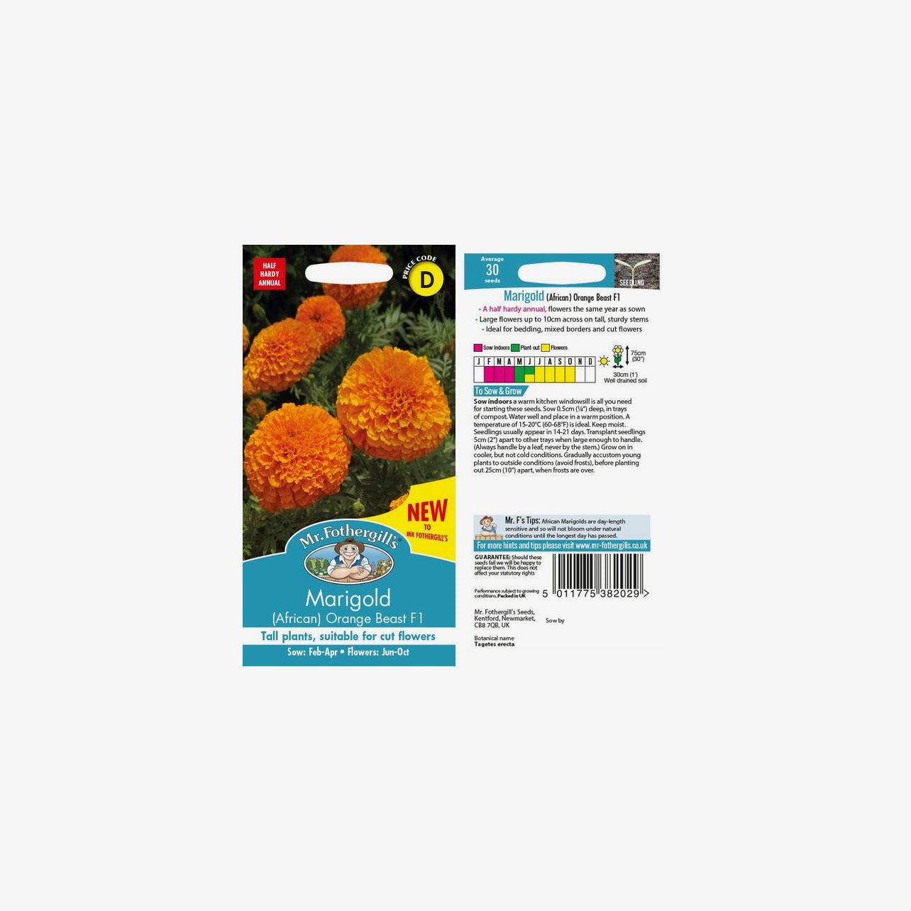 Odlingsanvisning: Tagetes Orange Beast F1 kan både förodlas inomhus och direktsås utomhus. För säkrast resultat förodlas fröerna inomhus från februari till april. Så fröerna cirka 0,5 cm djupt i såjord och håll jorden jämnt fuktig vid cirka 15–20 °C. Groning sker normalt inom 14–21 dagar. När plantorna är tillräckligt stora planteras de om med cirka 5 cm mellanrum och odlas vidare ljust men svalare. Avhärda plantorna och plantera ut i väldränerad jord när frostrisken är över, vanligtvis under maj till juni, med cirka 25 cm mellanrum. Sorten kan även direktsås utomhus under april till maj genom att så fröerna cirka 1,5 cm djupt på växtplatsen. Tagetes trivs bäst i soligt läge och blommar från försommaren till hösten.