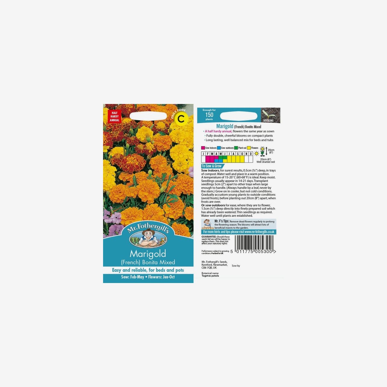 Odlingsanvisning: Tagetes French Bonita Mix kan både förodlas inomhus och direktsås utomhus. För säkrast resultat förodlas fröerna inomhus från februari till april. Så fröerna cirka 0,5 cm djupt i såjord och håll jorden jämnt fuktig vid cirka 15–20 °C. Groning sker normalt inom 14–21 dagar. När plantorna är tillräckligt stora planteras de om med cirka 5 cm mellanrum och odlas vidare ljust men svalare. Avhärda plantorna och plantera ut i väldränerad jord när frostrisken är över, vanligtvis under maj till juni, med cirka 20 cm mellanrum. Sorten kan även direktsås utomhus under april till maj. Tagetes trivs bäst i soligt läge och blommar rikligt från försommaren till hösten.