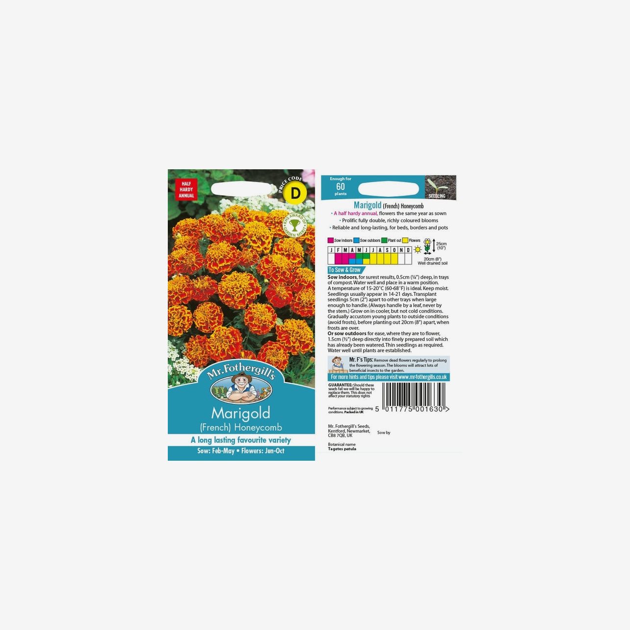 Odlingsanvisning: Tagetes Honeycomb kan både förodlas inomhus och direktsås utomhus. För säkrast resultat förodlas fröerna inomhus från februari till april. Så fröerna cirka 0,5 cm djupt i såjord och håll jorden jämnt fuktig vid cirka 15–20 °C. Groning sker normalt inom 14–21 dagar. När plantorna är tillräckligt stora planteras de om med cirka 5 cm mellanrum och odlas vidare ljust men svalare. Avhärda plantorna och plantera ut i väldränerad jord när frostrisken är över, vanligtvis under maj till juni, med cirka 20 cm mellanrum. Sorten kan även direktsås utomhus under april till maj. Tagetes trivs bäst i soligt läge och blommar rikligt från försommaren till hösten.
