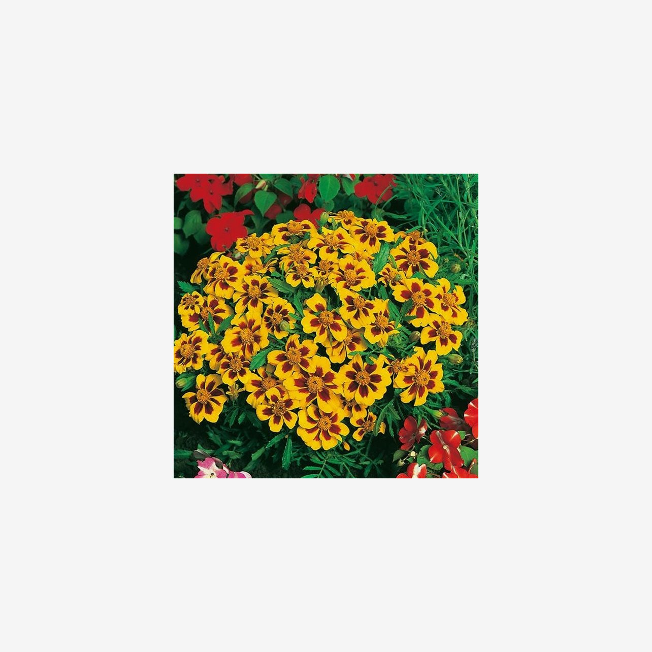 agetes Naughty Marietta är en livlig och lättodlad sommarblomma med klargula blommor som pryds av en tydlig vinröd fläck i mitten. Den kompakta växtformen och den starka färgkontrasten gör sorten utmärkt för rabatter, kanter och krukor där den blommar rikligt hela säsongen.