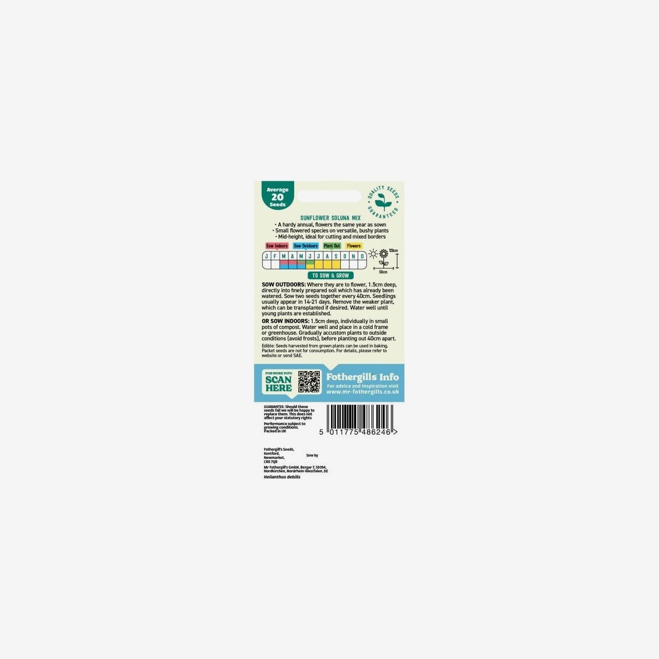 Odlingsanvisning: Solros Soluna Mix kan både direktsås utomhus och förodlas inomhus. Direktså fröerna på växtplatsen när jorden har värmts upp genom att så cirka 1,5 cm djupt i väl förberedd och fuktad jord. Så två fröer tillsammans med cirka 40 cm mellanrum och ta bort den svagare plantan efter uppkomst. För tidigare blomning kan fröerna förodlas inomhus genom att så ett frö per kruka, cirka 1,5 cm djupt. Håll jorden jämnt fuktig. Avhärda plantorna och plantera ut när frostrisken är över, med cirka 40 cm mellan plantorna. Solros trivs bäst i soligt läge och blommar under sommaren.