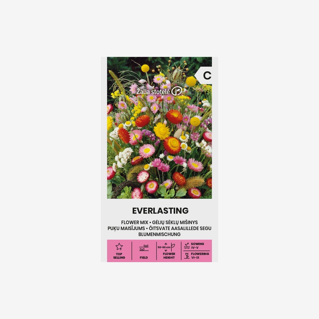 Blomsterblandning Eterneller är en färgstark mix av sommarblommor som lämpar sig särskilt väl för snitt och torkning. Blommorna kompletterar varandra väl och passar i både rabatt och kruka, där de blommar under lång tid.