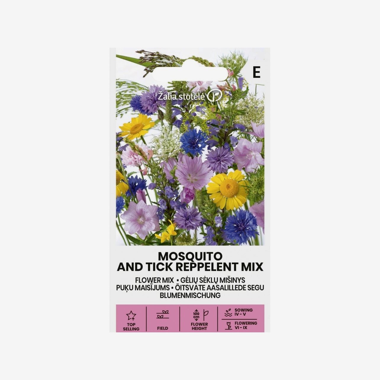 Blomsterblandning Mot mygg och fästingar är en dekorativ sommarblandning som kombinerar färgrik blomning med växter som traditionellt används för att minska förekomsten av mygg och fästingar. Blandningen ger ett naturligt, ängslikt intryck och blommar successivt under hela säsongen.