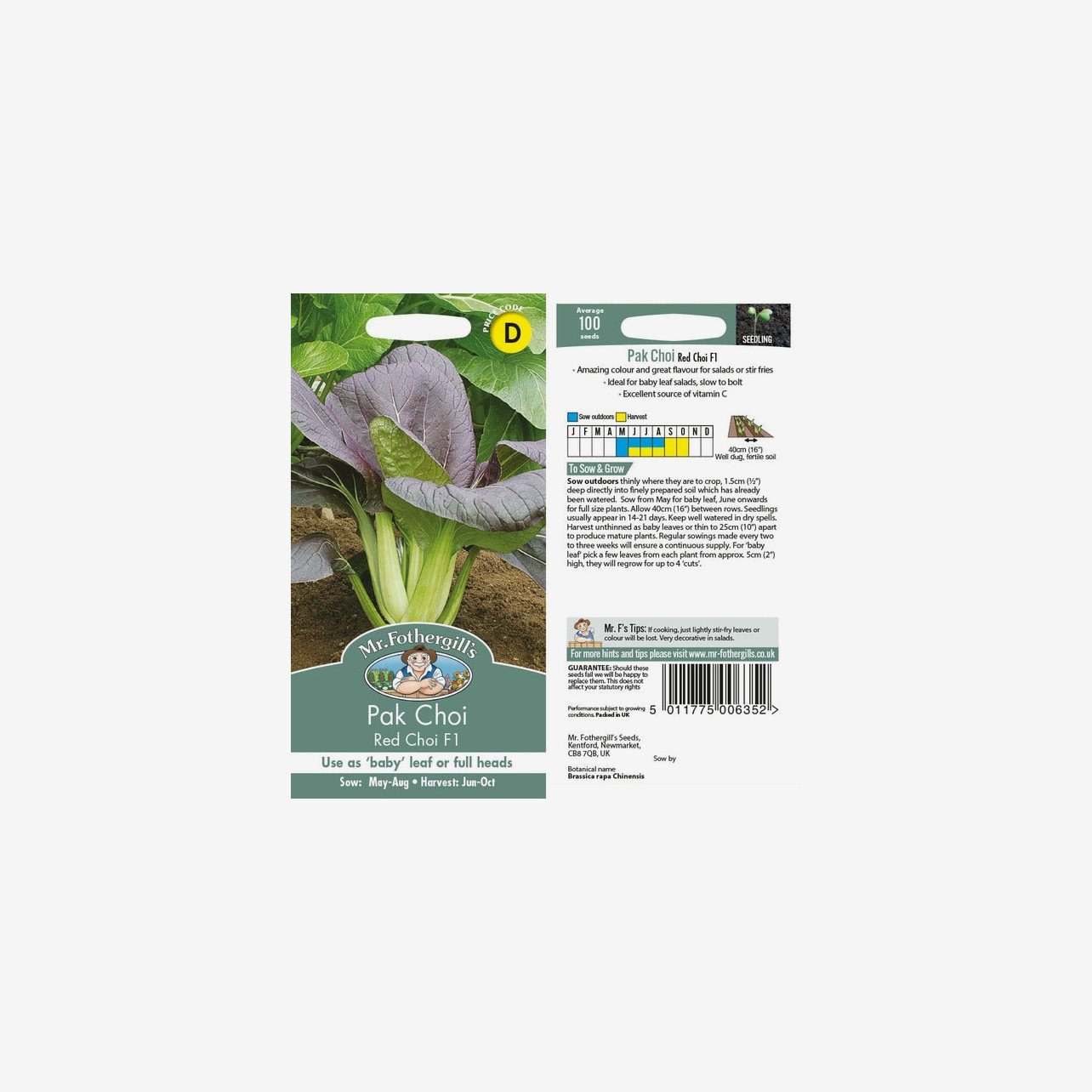 Kål Pak Choi Red Choi F1 är en dekorativ och snabbväxande asiatisk bladgrönsak med vackra rödvioletta blad och krispiga stjälkar. Den har en mild och god smak som passar perfekt i sallader, wok och asiatiska rätter. Sorten kan skördas både som späda babyblad eller som fullt utvecklade plantor och är dessutom relativt motståndskraftig mot att gå i blom. En lättodlad och näringsrik grönsak som ger färg och smak i köksträdgården.