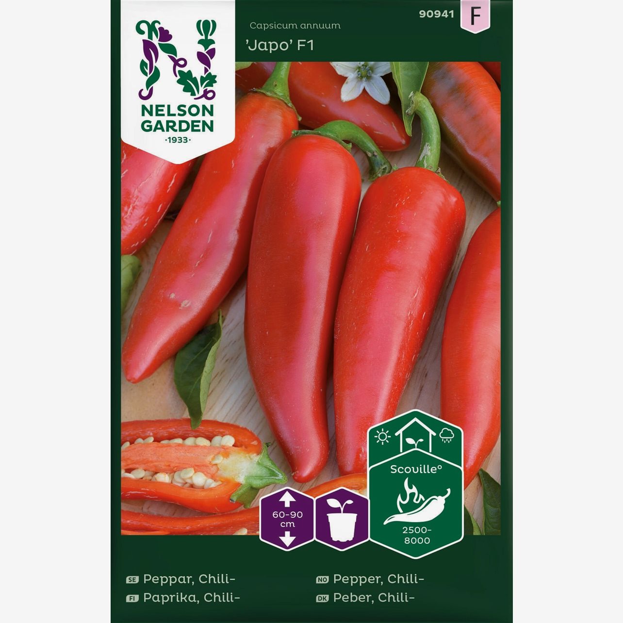 Med Japo F1 får du en tidig chili som du kan odla i kruka på vindskyddad plats eller i växthus. Japo F1 bildar en kraftig planta med mycket frukt. Frukten är mellanstor, av jalapeñotyp. Frukten kan ätas både grön och röd. Odlas bäst i växthus eller på en solig och vindskyddad plats. Trivs i välgödslad och väldränerad jord. Vattna regelbundet.