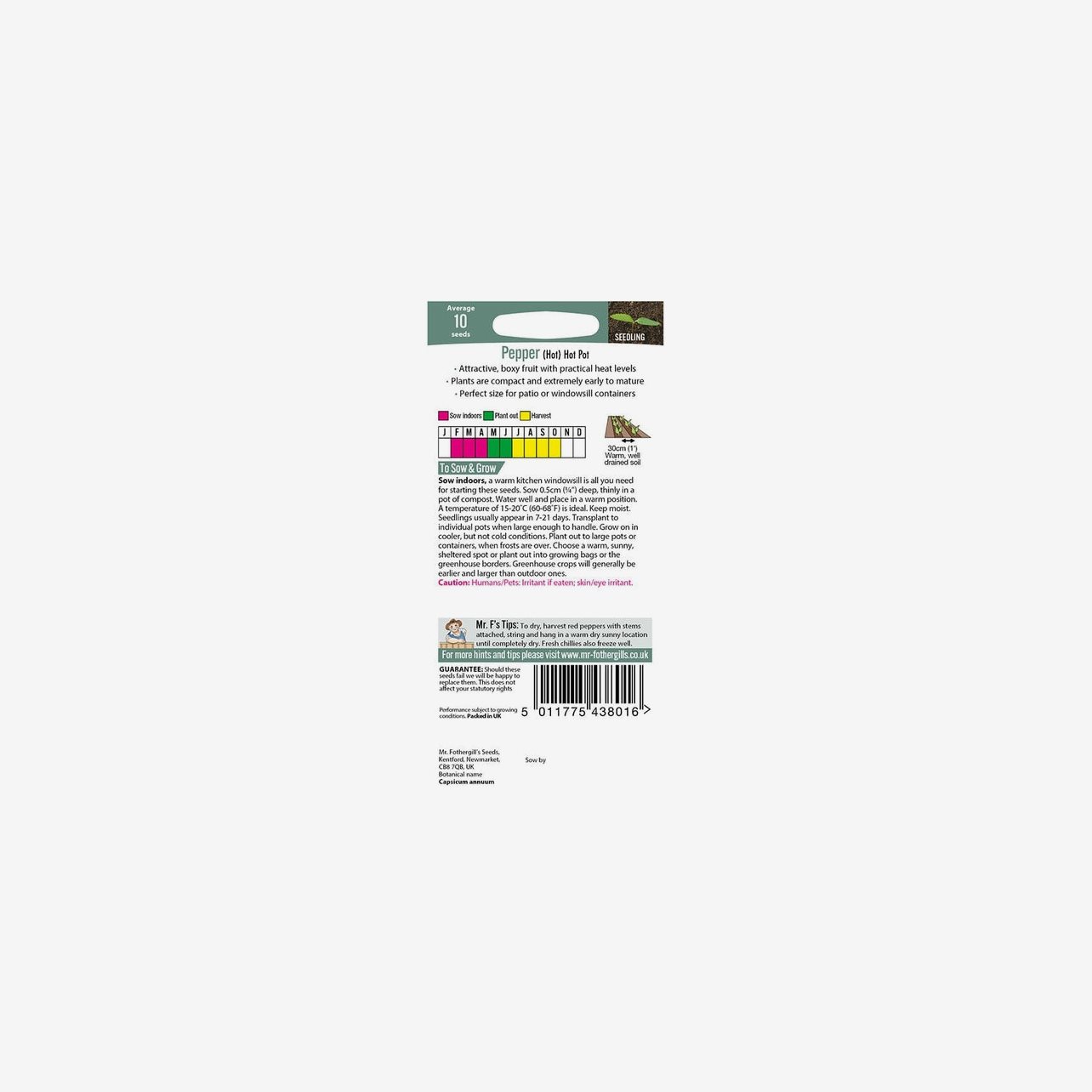 Fröpåsen innehåller i genomsnitt 10 fröer. Det latinska namnet är Capsicum annuum. Plantorna är dvärgväxande och särskilt lämpade för krukor och behållare.