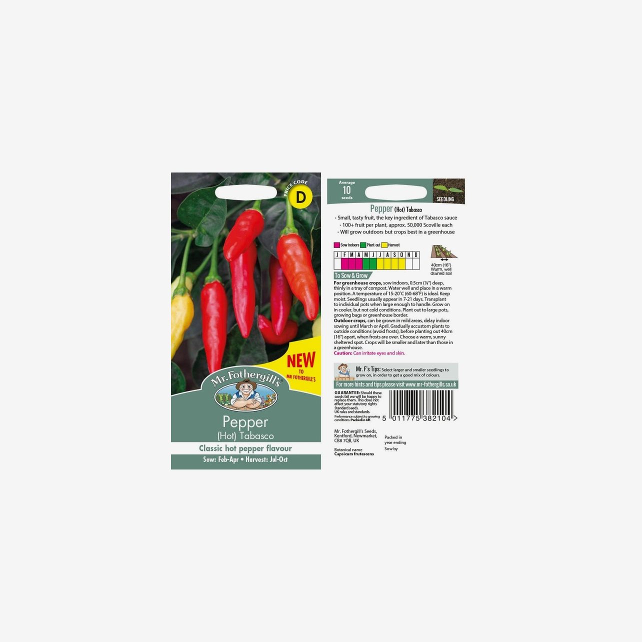 Odlingsanvisning: Förodla inomhus tidigt, från januari till mars. Så fröerna cirka 0,5 cm djupt i fuktig såjord och placera sådden varmt, gärna vid 22–25 °C. Håll jorden jämnt fuktig. Groning sker normalt inom 10–21 dagar. När plantorna är tillräckligt stora planteras de om i separata krukor och odlas vidare ljust. Avhärda plantorna noggrant och plantera ut i växthus, stora krukor eller på varm, solig och skyddad plats utomhus när frostrisken är helt över. Capsicum frutescens trivs bäst med hög värme, mycket ljus och regelbunden vattning. Skörda frukterna när de är fullt röda för bästa smak och styrka.