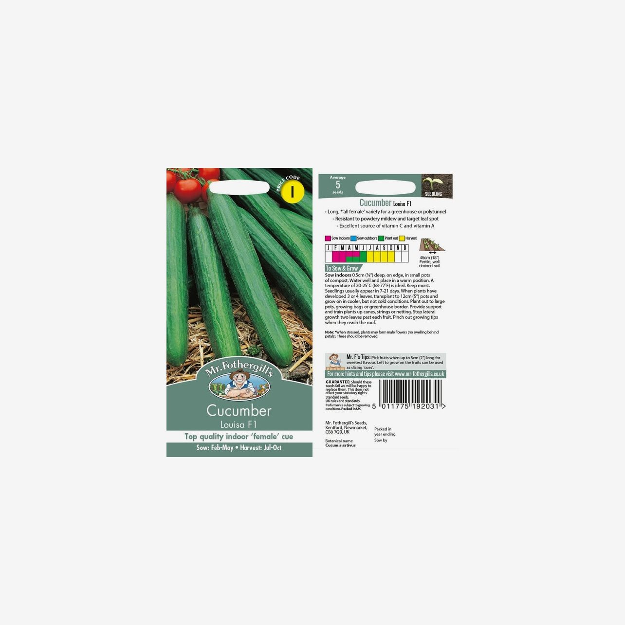 Fröpåsen innehåller 5 fröer. Det latinska namnet är Cucumis sativus. Gurkorna är långa och smala med jämn form och hög kvalitet. Sorten är avsedd för odling i växthus eller polytunnel.