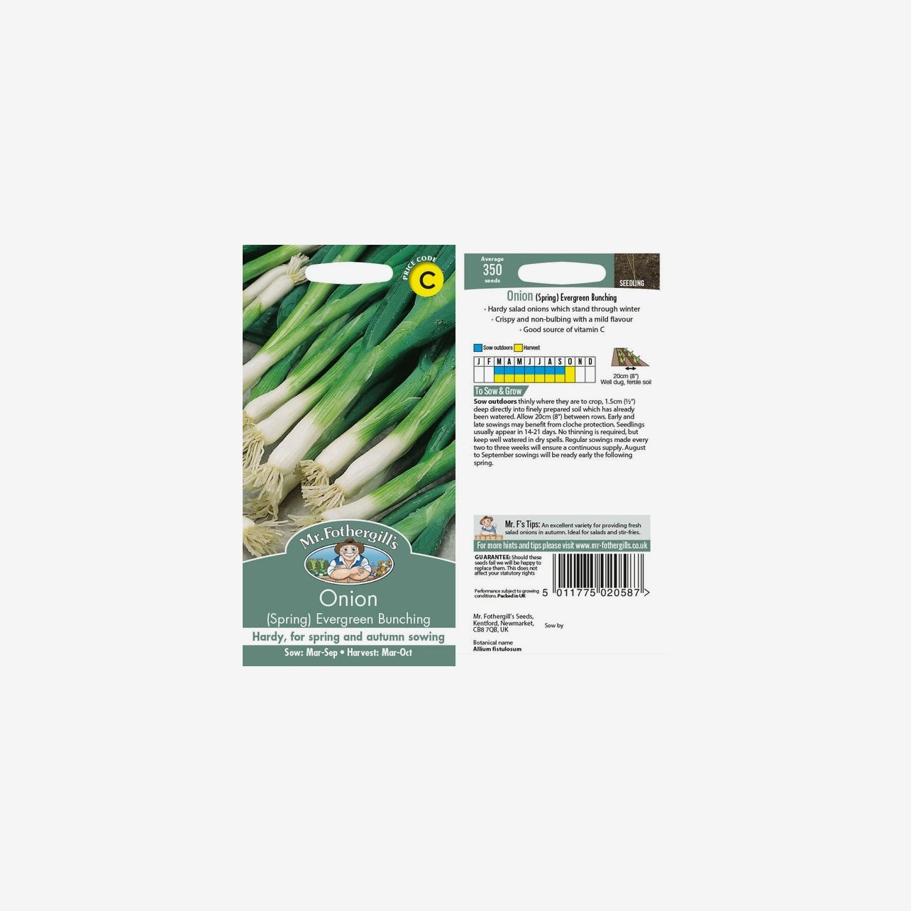 Fröpåsen innehåller cirka 350 fröer. Det latinska namnet är Allium fistulosum. Plantorna blir omkring 30–40 cm höga och växer i täta tuvor med raka, vita stjälkar och gröna blad. Sorten är icke-lökbildande och skördas som salladslök.