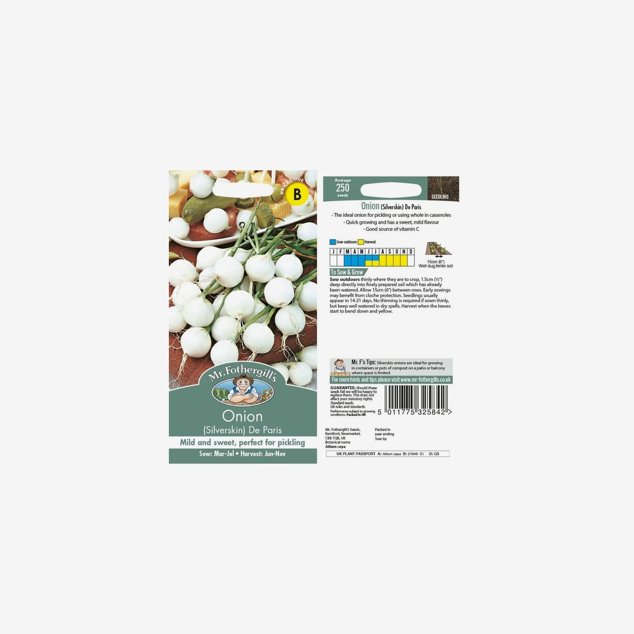 Odlingsanvisning: Lök De Paris Silverskin kan både förodlas inomhus och direktsås utomhus. För säkrast resultat förodlas fröerna inomhus under mars till april. Så cirka 0,5 cm djupt i såjord och håll jorden jämnt fuktig vid cirka 15–20 °C. Groning sker normalt inom 14–18 dagar. När plantorna är tillräckligt stora planteras de om i egna krukor och odlas vidare ljust men svalt. Avhärda plantorna och plantera ut när frostrisken är över, med cirka 30 cm mellanrum. För enklare odling kan sorten även direktsås utomhus under maj till juni, cirka 0,5 cm djupt i fuktad, fin jord och gallras till cirka 30 cm mellan plantorna. Löken trivs bäst i soligt läge och kan skördas både tidigt som färsk lök eller senare som små, fullmogna lökar.