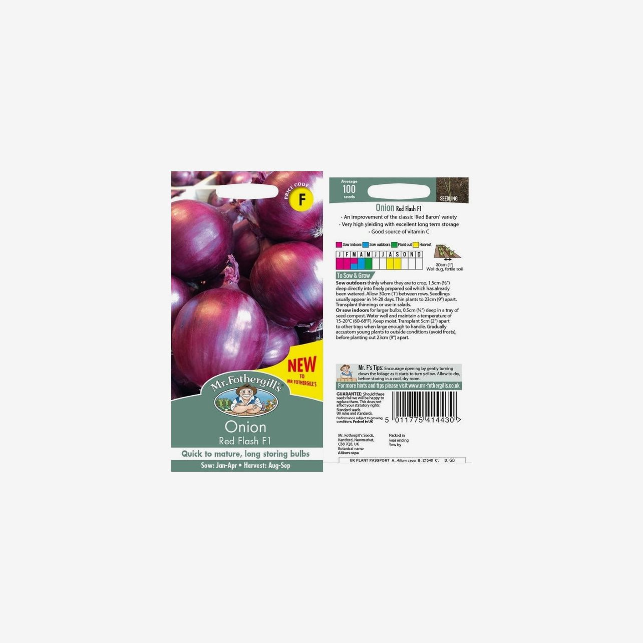 Odlingsanvisning: Lök Red Flash F1 kan både direktsås utomhus och förodlas inomhus för större lökar. Direktså fröerna tunt utomhus när jorden reder sig på våren, vanligtvis under april till maj. Så cirka 1,5 cm djupt i välbearbetad, fuktad jord med cirka 30 cm mellan raderna och gallra senare till omkring 23 cm mellan plantorna. För förodling sås fröerna inomhus från februari till mars, cirka 0,5 cm djupt i såjord. Placera ljust och håll jorden jämnt fuktig vid cirka 15–20 °C. När plantorna är tillräckligt stora planteras de om och avhärdas innan utplantering. Plantera ut med cirka 23 cm mellanrum när frostrisken är över. Löken trivs bäst i soligt läge och väldränerad jord och skördas när blasten lagt sig under sensommaren.