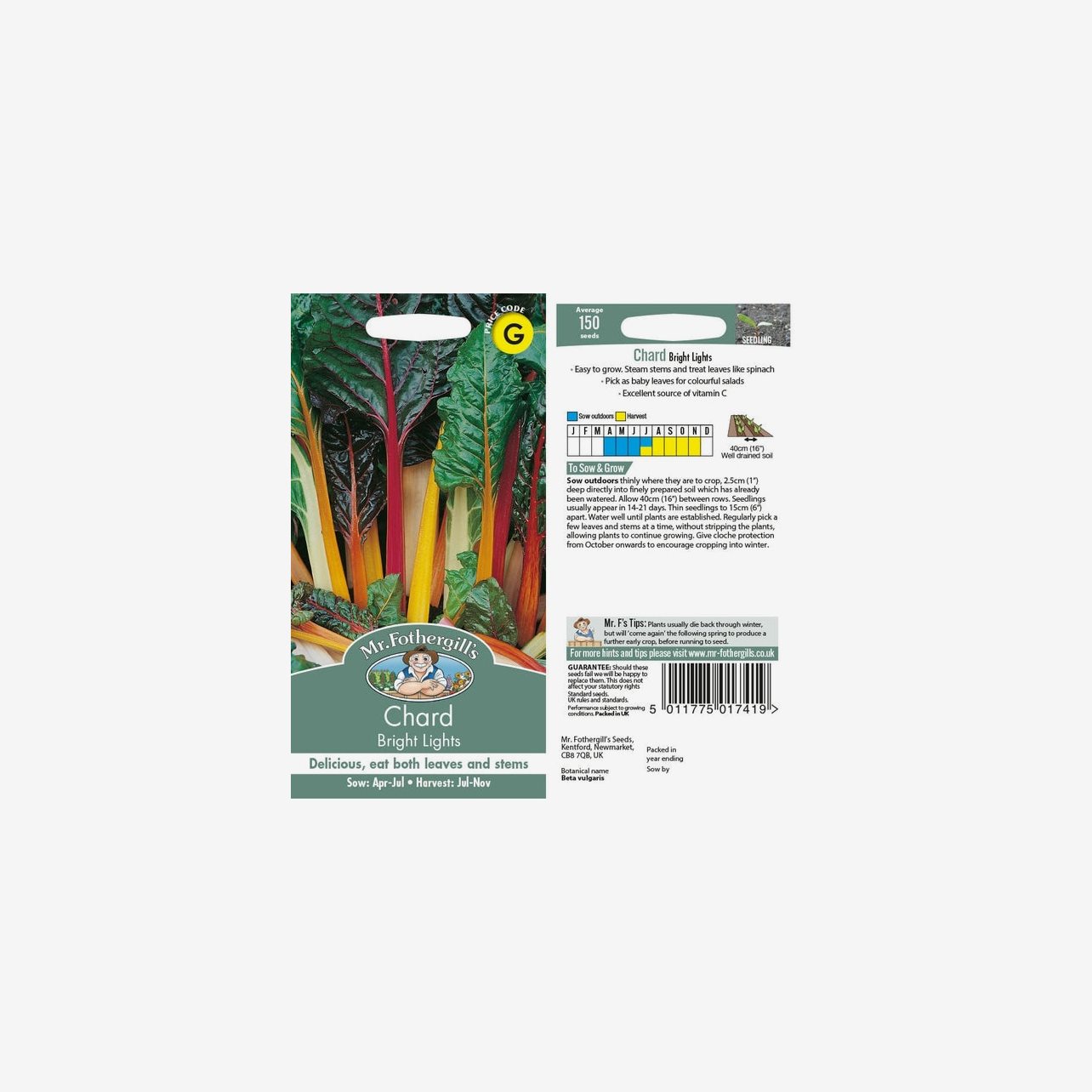 Mangold Bright Lights är en mycket dekorativ sort med färgstarka stjälkar i gult, rött, rosa och orange. Den är både vacker och användbar i köksträdgården och ger skörd under lång tid.