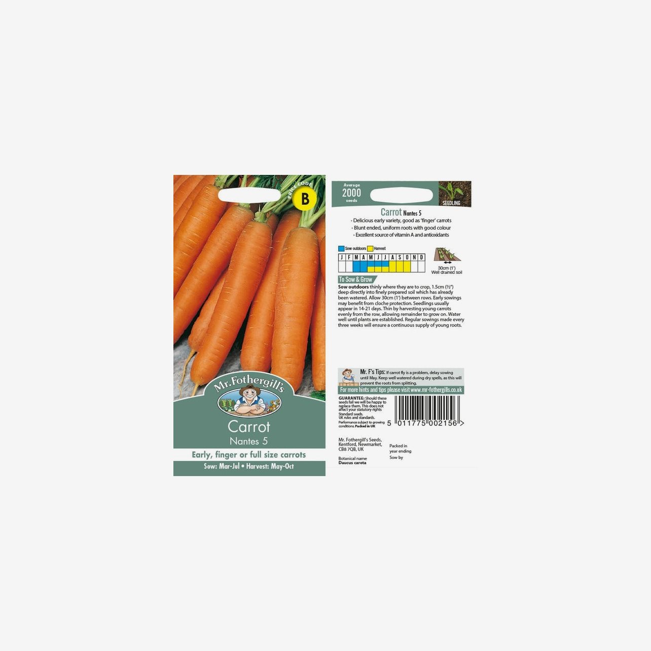 Morot Nantes 5 är en mycket omtyckt sort med cylindriska, släta rötter och söt, krispig smak. Den passar utmärkt för färskkonsumtion och lagring och ger pålitliga skördar i köksträdgården.