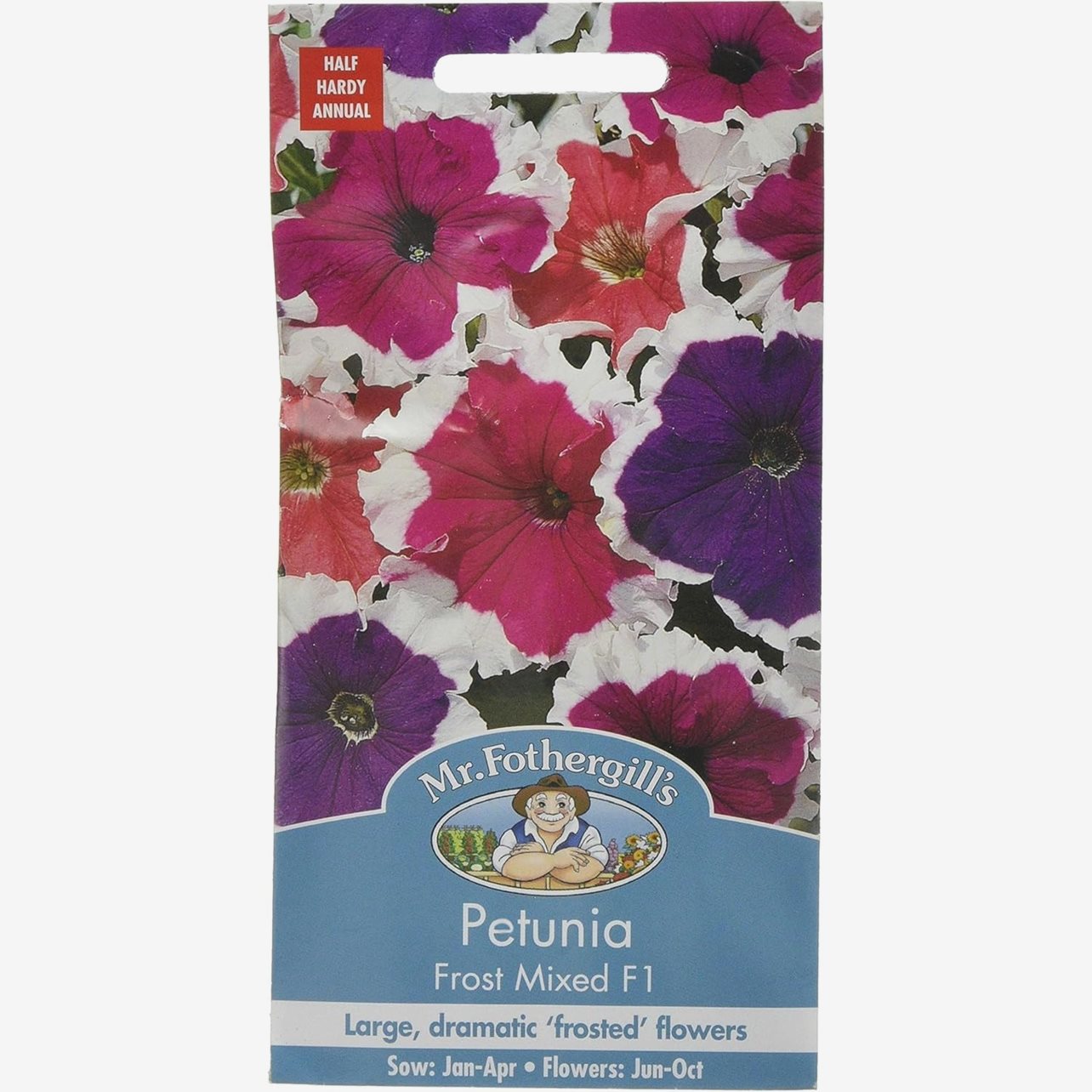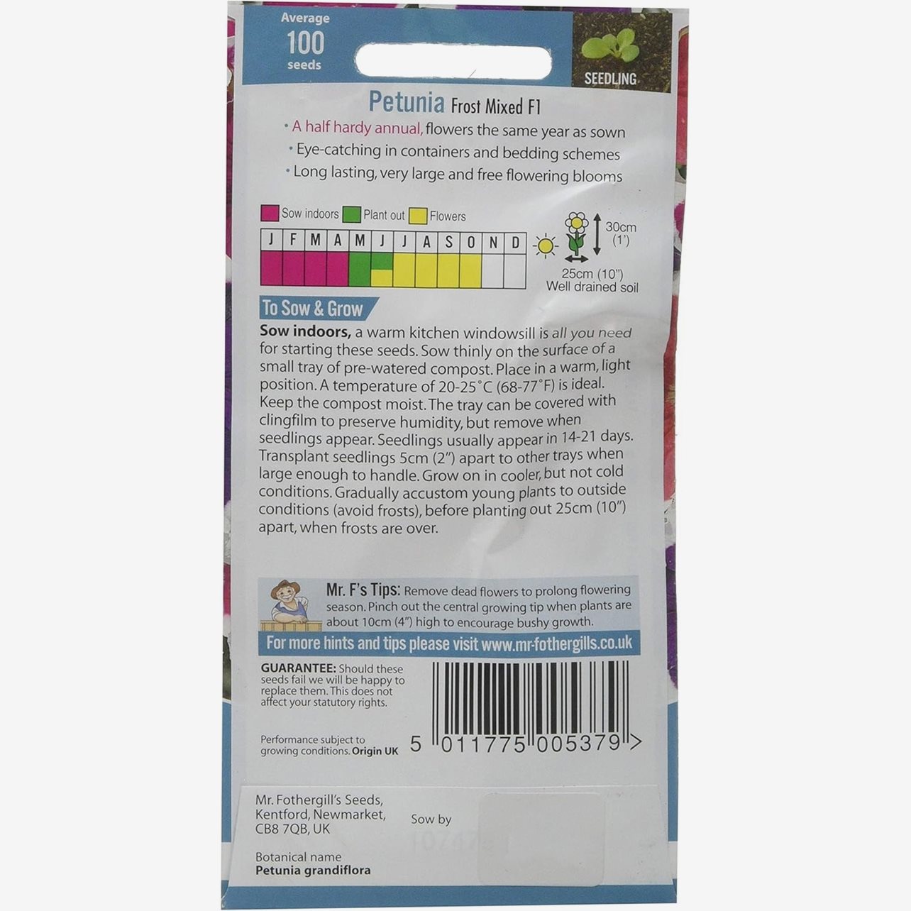Petunia Frost mix F1 är en imponerande sort med stora blommor i “frostade” färgtoner som ger ett elegant och iögonfallande uttryck. Perfekt för krukor, lådor och sommarplanteringar i rabatt.