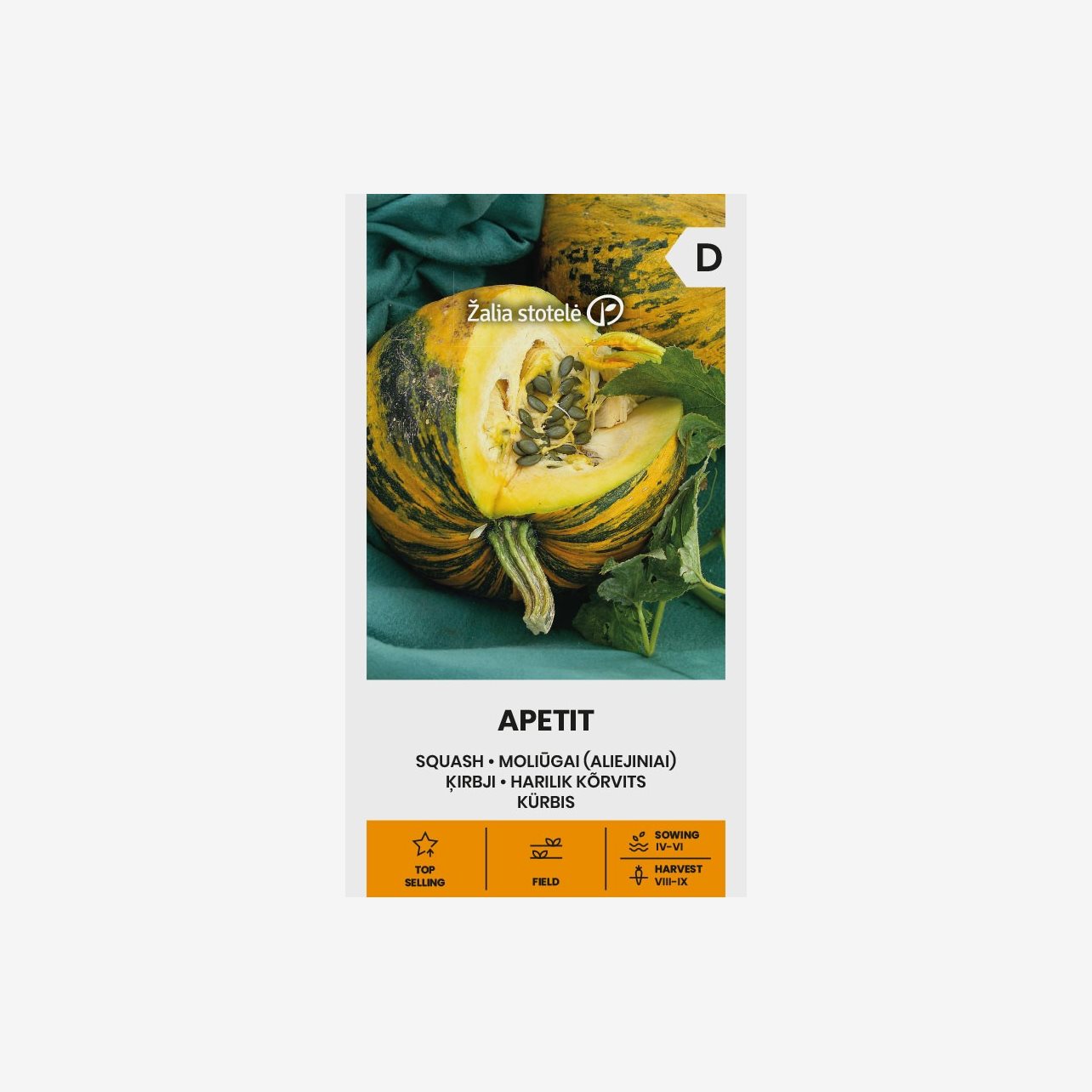 Pumpa Apetit är en högavkastande oljepumpa som odlas främst för sina stora, skalfria frön. Fröerna är mörkbruna, smakrika och uppskattade för sitt naturliga innehåll av zink.