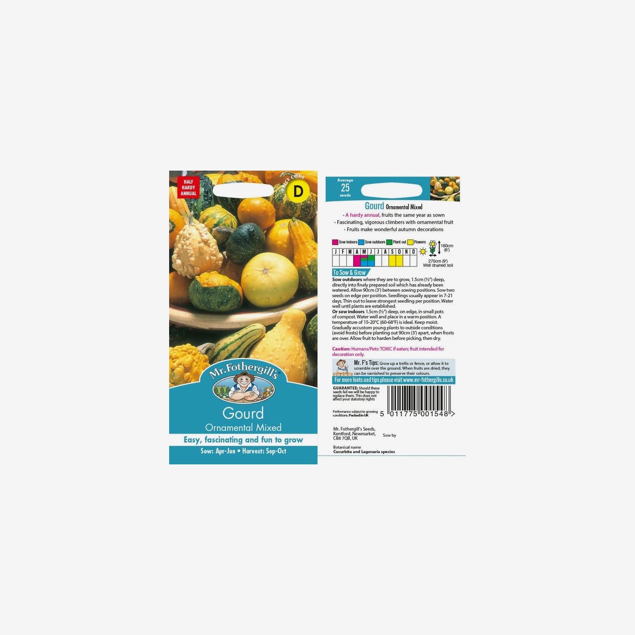 Fröpåsen innehåller cirka 25 fröer. Det latinska namnet är Cucurbita pepo och plantorna får långa rankor som kan bli cirka 200 cm långa.