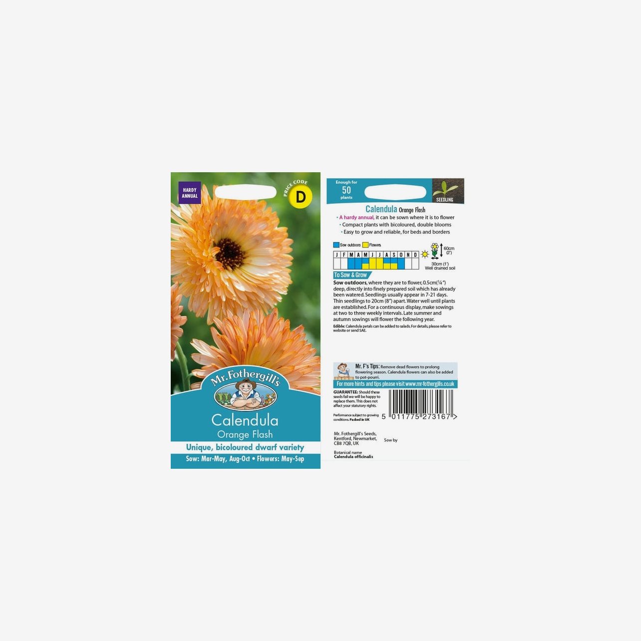 Ringblomma Orange Flash är en livfull sort med klara orange blommor som ger stark färg i rabatter och krukor. Den är lättodlad, tålig och blommar rikligt under hela sommaren.