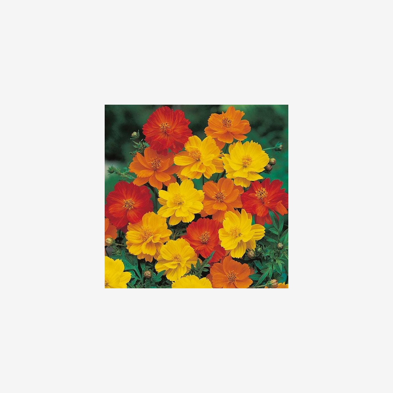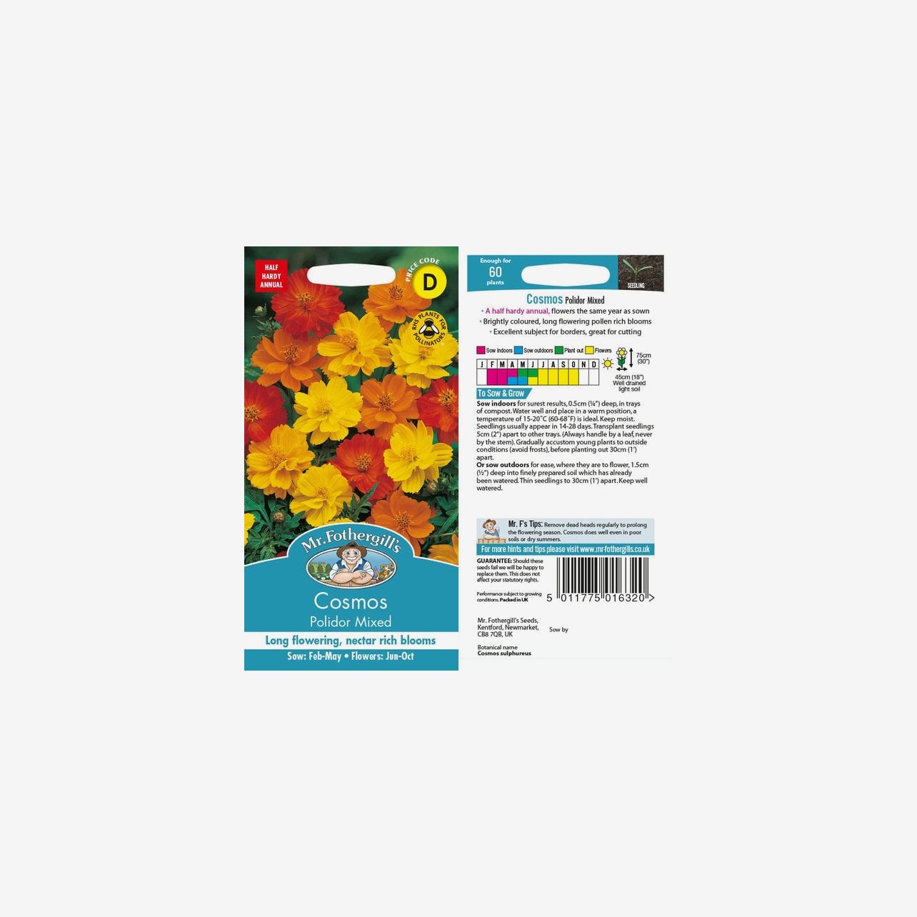 Fröpåsen innehåller cirka 60 fröer. Växtens latinska namn är Cosmos sulphureus och den blir cirka 75 cm hög.