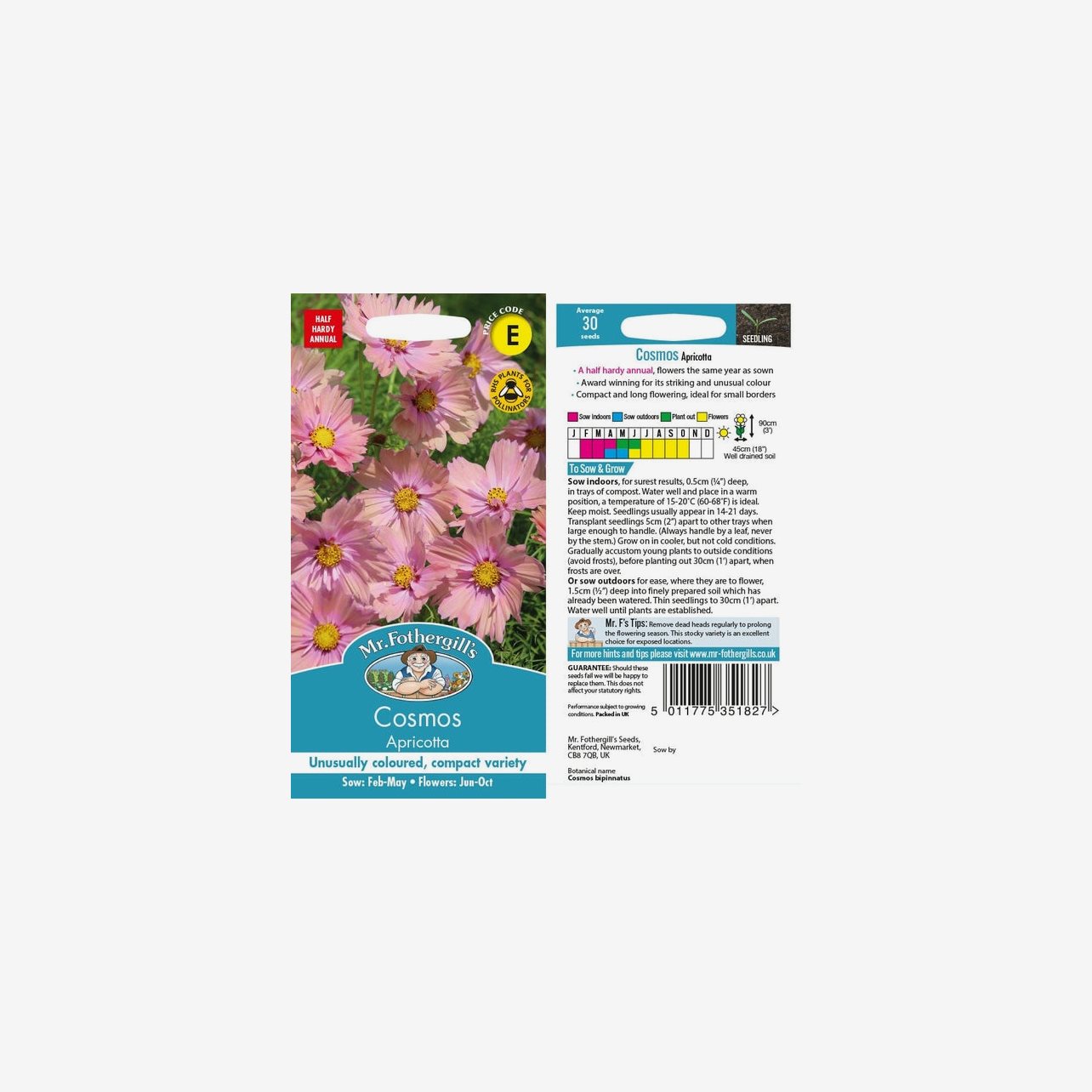 Fröpåsen innehåller cirka 30 fröer. Det latinska namnet är Cosmos bipinnatus och plantorna blir cirka 90–120 cm höga.
