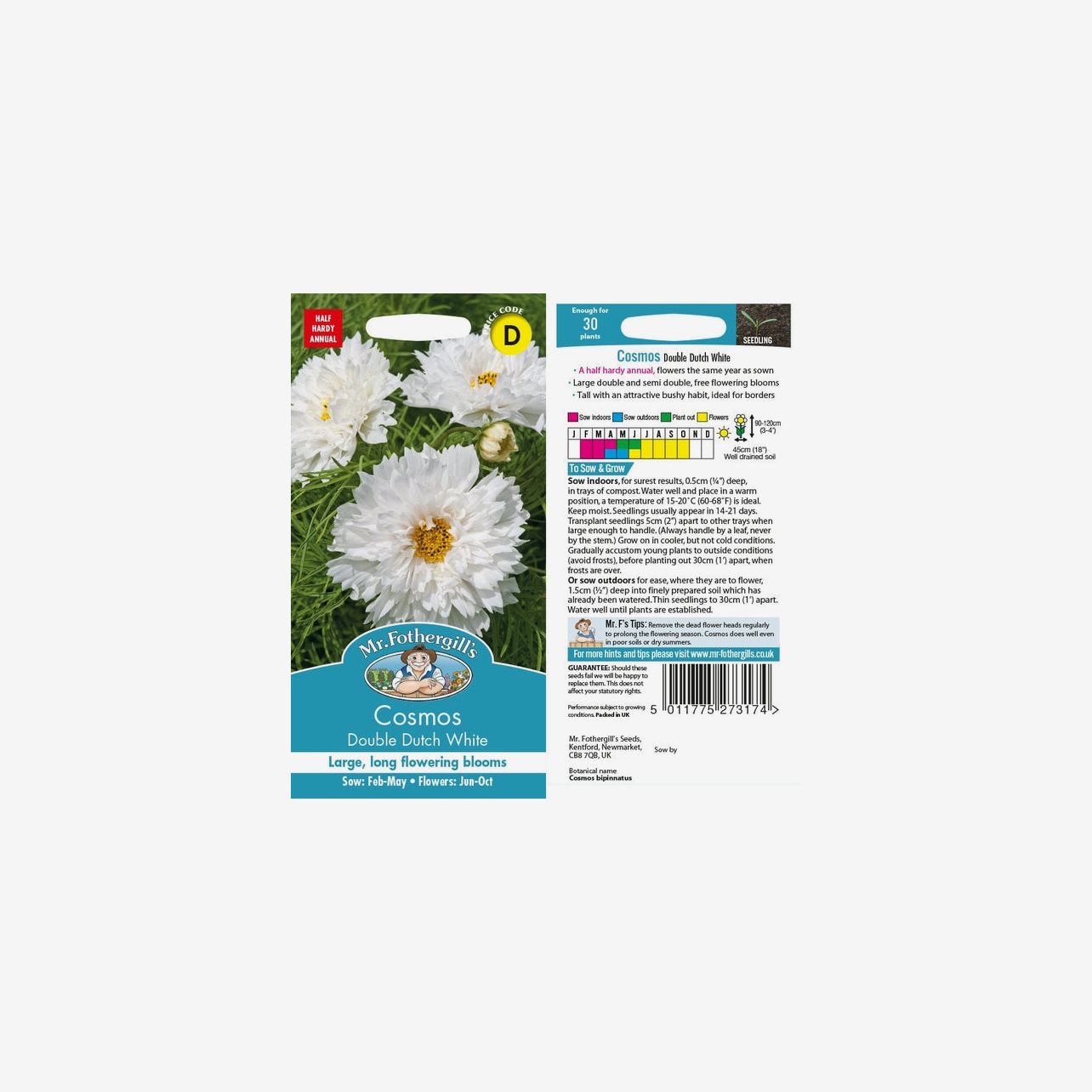 Fröpåsen innehåller cirka 30-40 fröer. Det latinska namnet är Cosmos bipinnatus och plantorna blir cirka 90–120 cm höga.