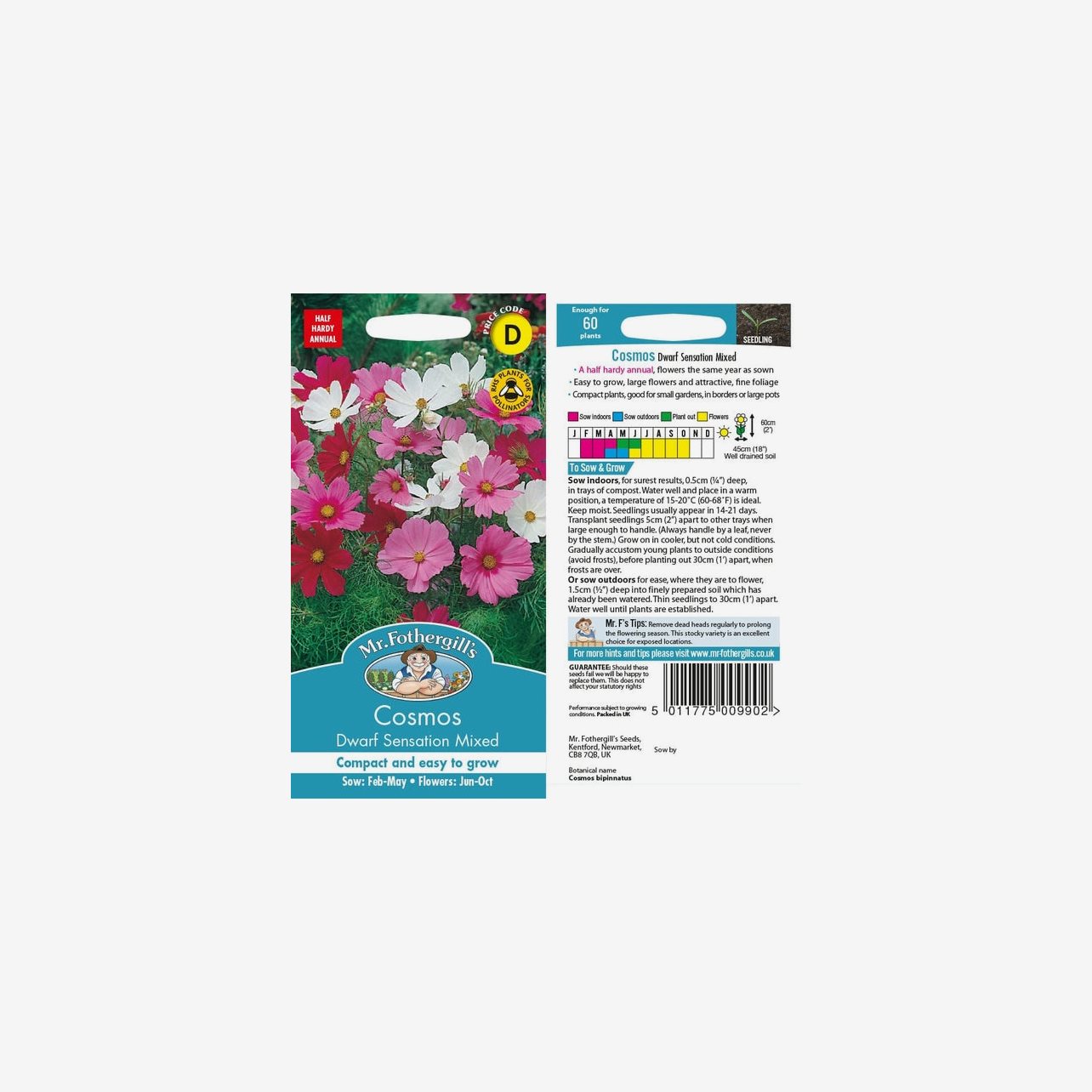 Fröpåsen innehåller cirka 60 fröer. Det latinska namnet är Cosmos bipinnatus och plantorna blir cirka 60 cm höga.