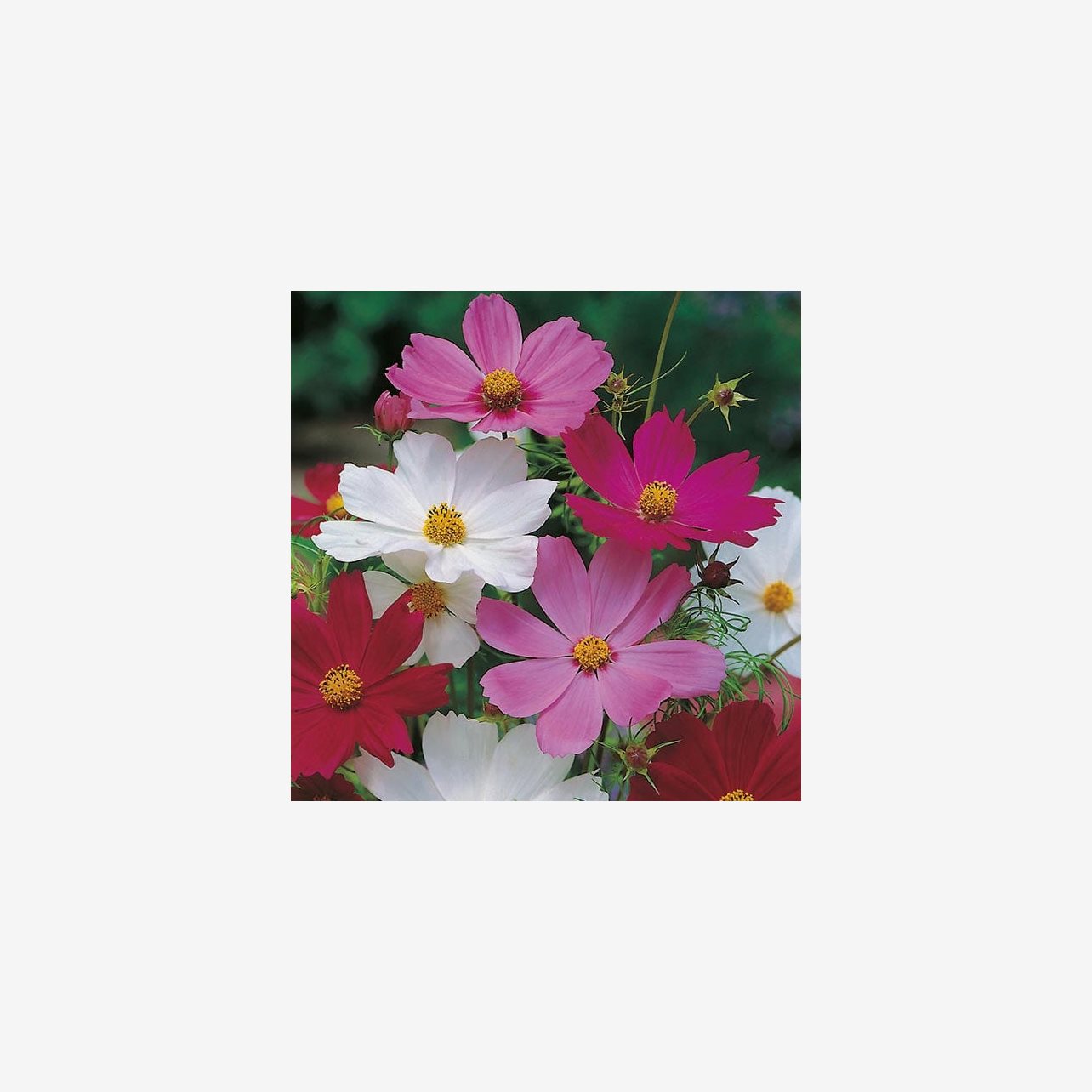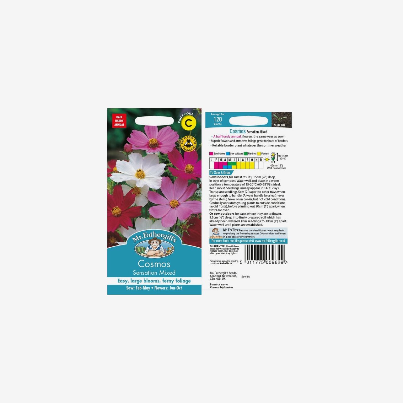 Fröpåsen innehåller cirka 150 fröer. Det latinska namnet är Cosmos bipinnatus och plantorna blir cirka 100–120 cm höga.