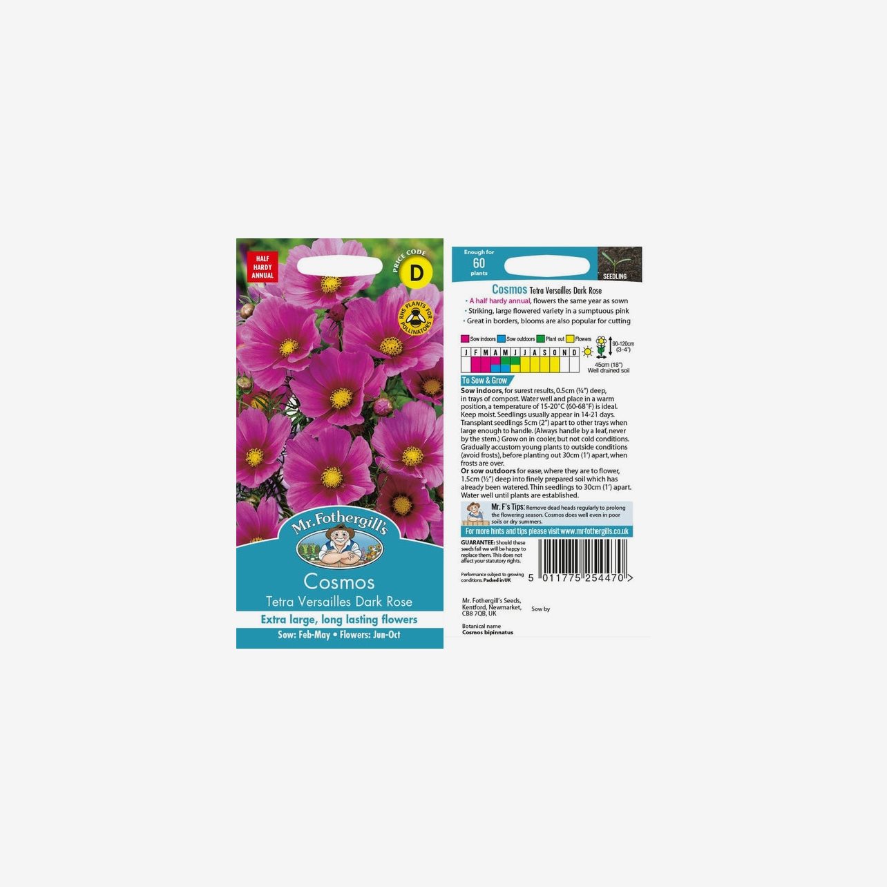 Fröpåsen innehåller cirka 100 fröer. Det latinska namnet är Cosmos bipinnatus och växten blir cirka 90–120 cm hög enligt Mr Fothergills produktinformation.