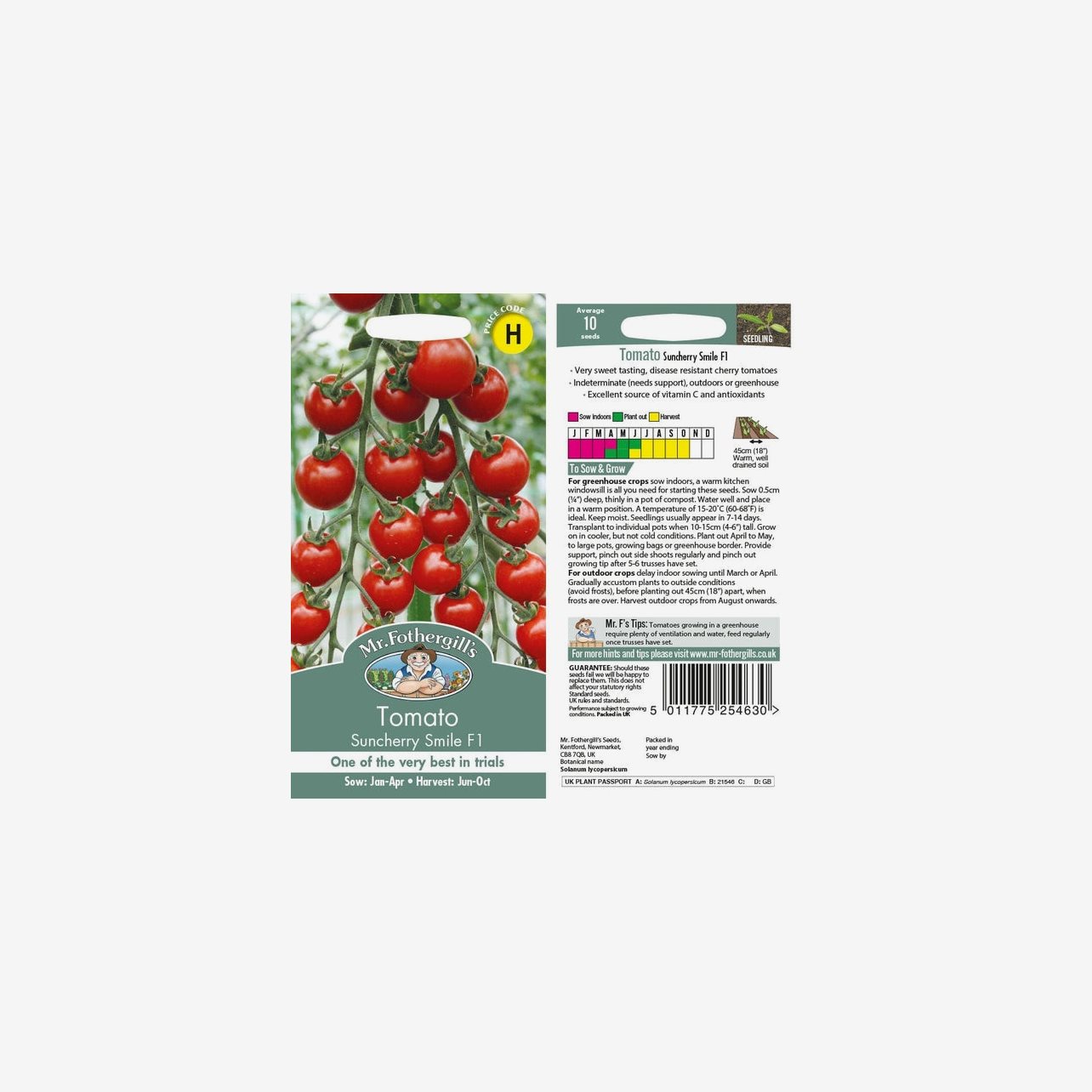Fröpåsen innehåller 10 fröer. Det latinska namnet är Lycopersicon lycopersicum. Suncherry Smile F1 är en högväxande tomat (indeterminate) som kräver uppbindning och regelbunden skötsel.