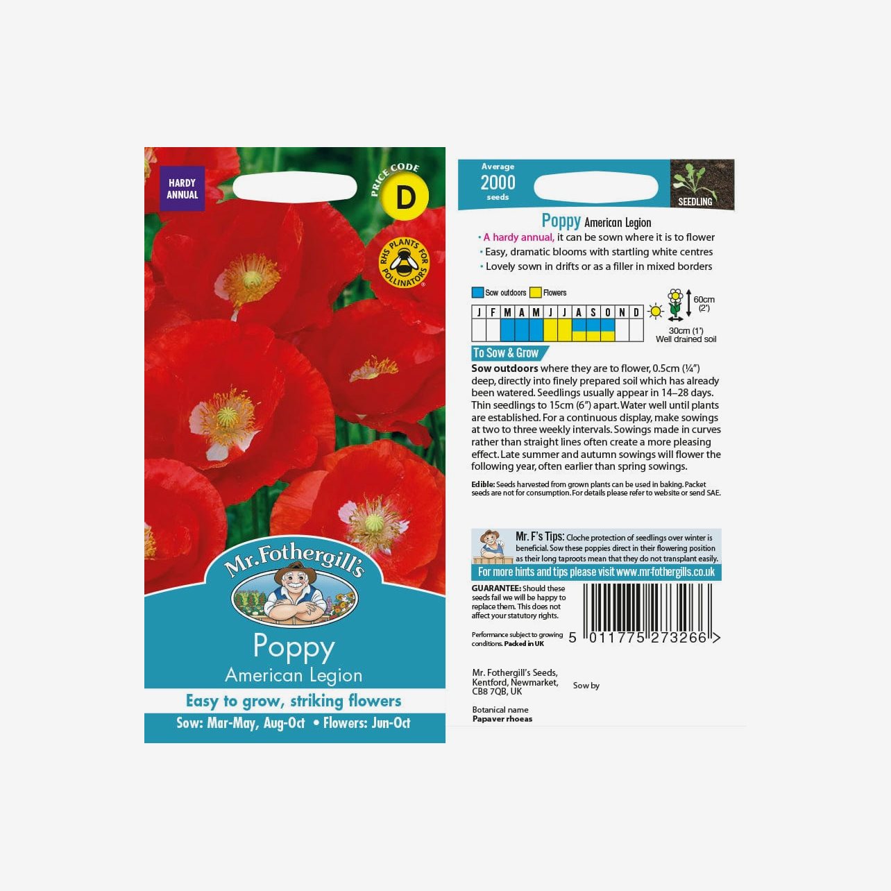 Kornvallmo American Legion är en klassisk och effektfull sommarblomma med intensivt röda blommor och tydliga ljusa centrum. Sorten ger ett starkt visuellt uttryck när den sås i större sjok och passar även utmärkt som utfyllnad i blandade rabatter där den bidrar med både färg och rörelse.