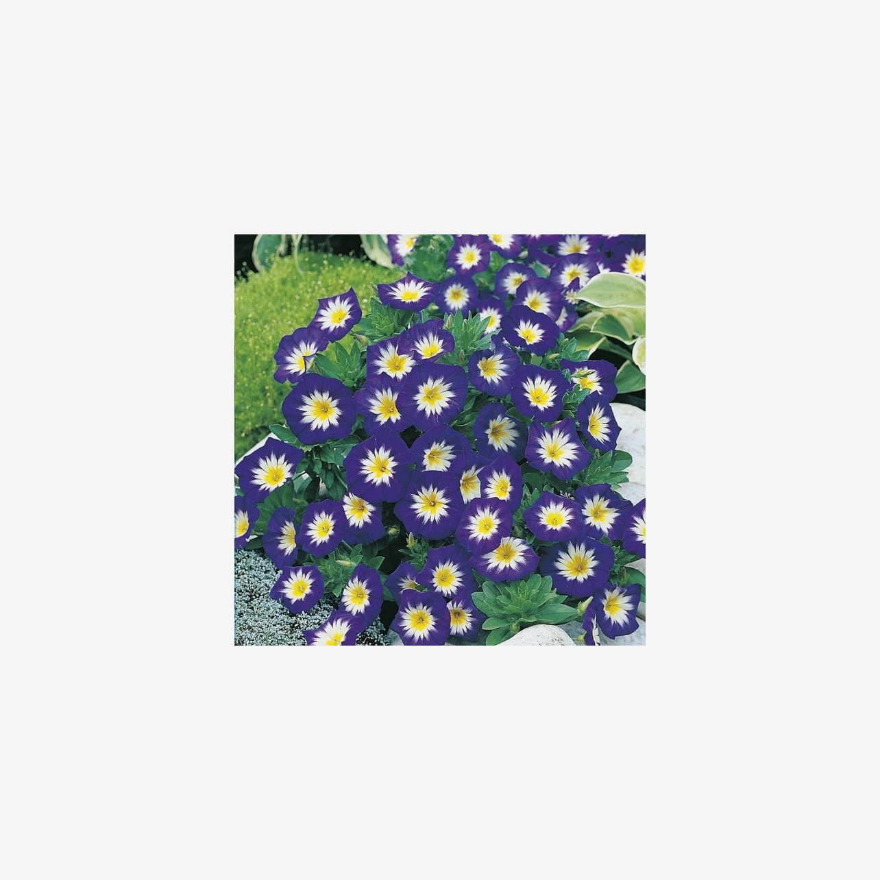Blue Ensign är en lite lägre blåvinda som breder ut sig i rabatten och ger vackra kontrastfulla blommor.