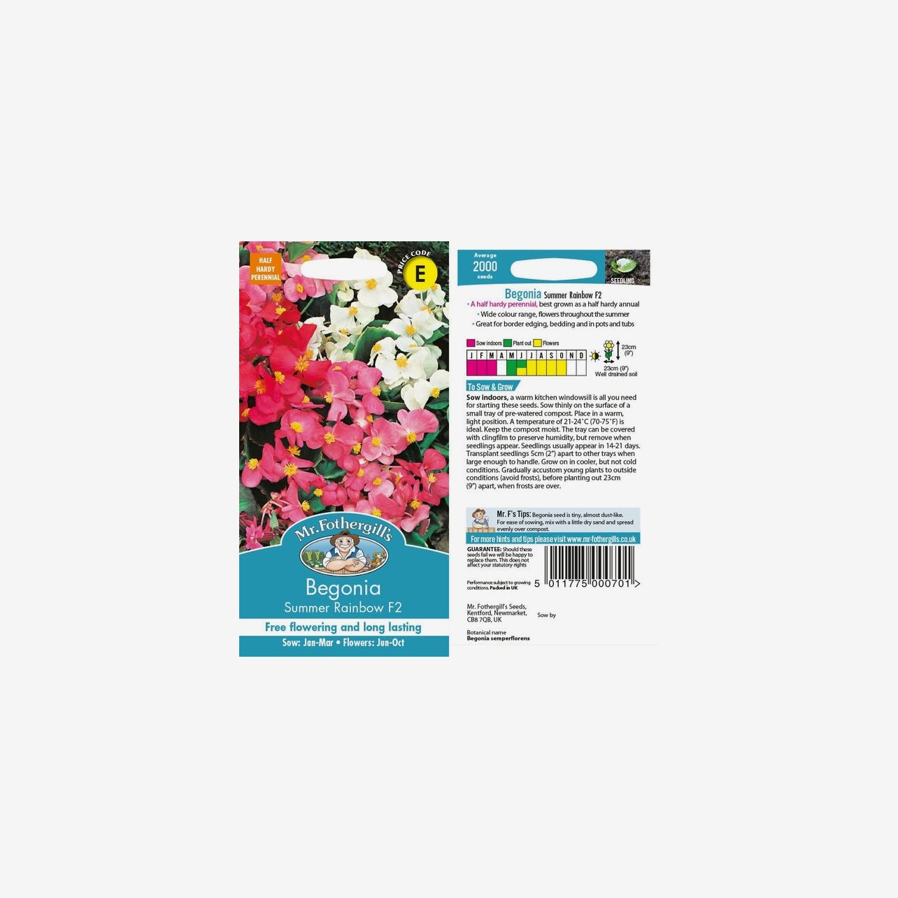 Fröpåsen innehåller cirka 200 fröer. Det latinska namnet är Begonia semperflorens och plantorna blir cirka 20–25 cm höga.