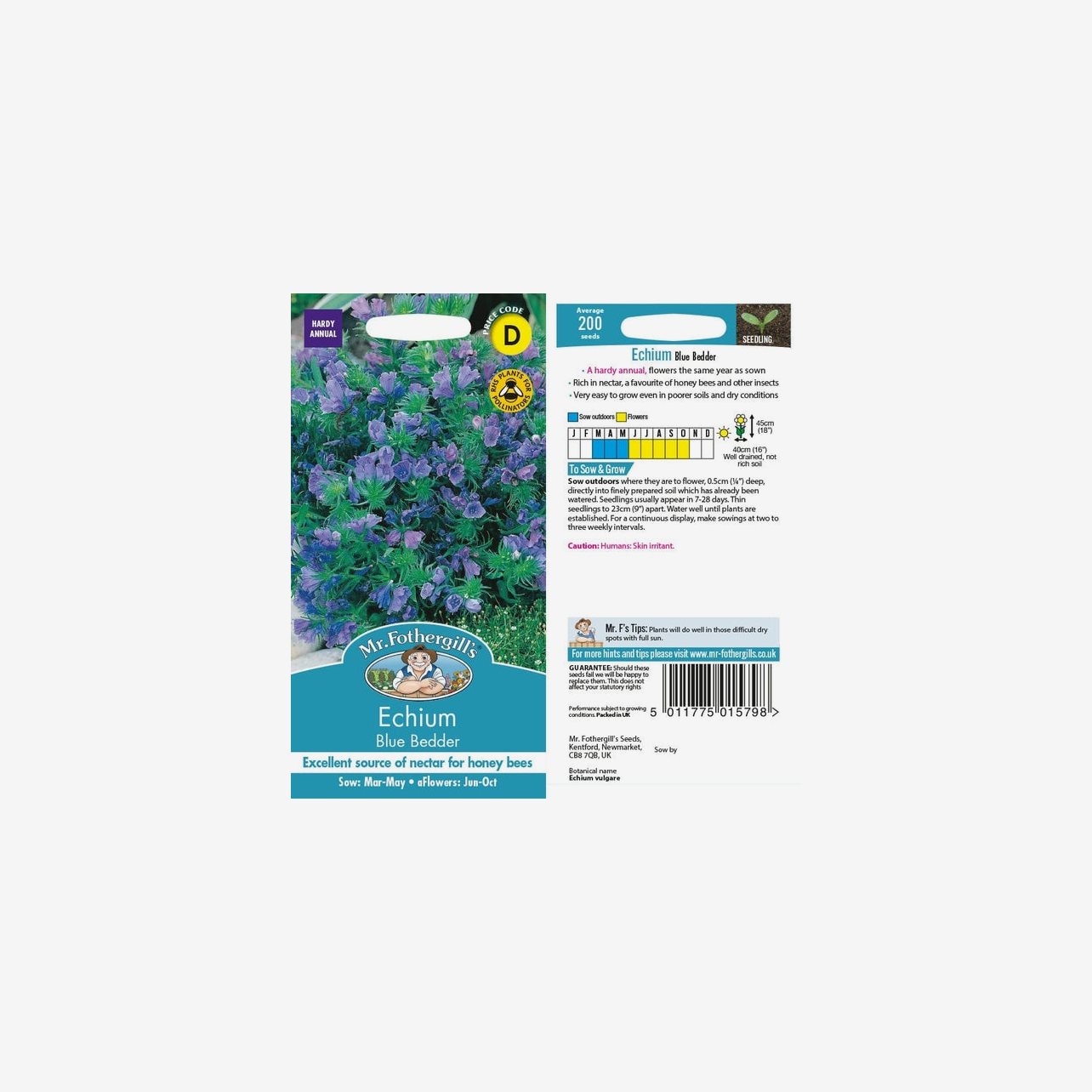 Fröpåsen innehåller cirka 200 fröer. Det latinska namnet är Echium plantagineum och plantorna blir cirka 40–50 cm höga.