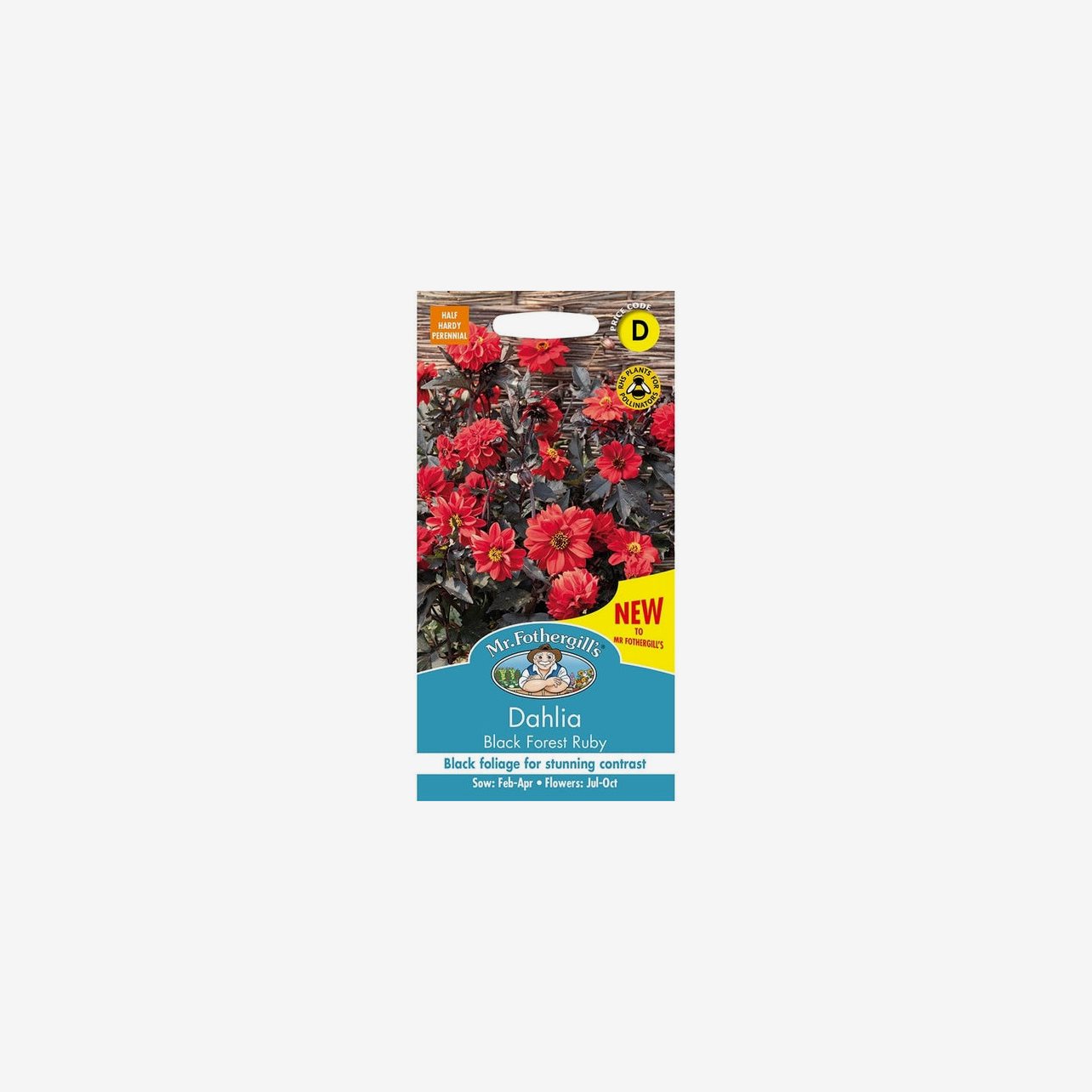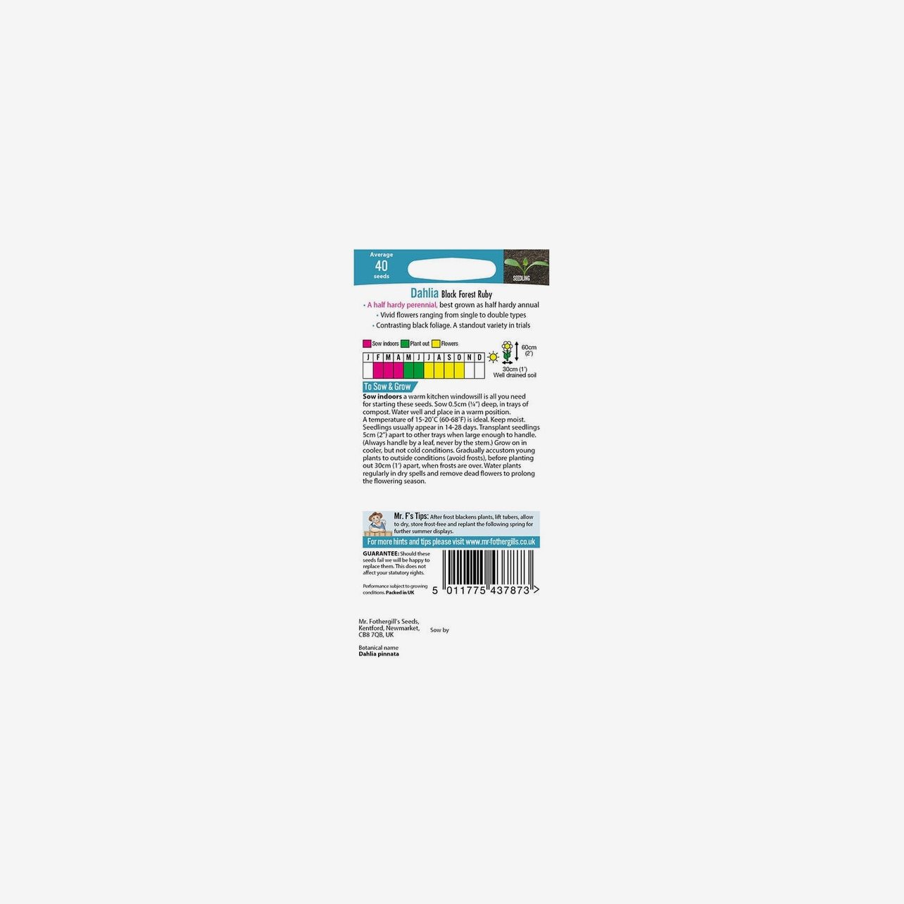 Fröpåsen innehåller cirka 50 fröer. Det latinska namnet är Dahlia pinnata och plantorna blir cirka 80–90 cm höga.