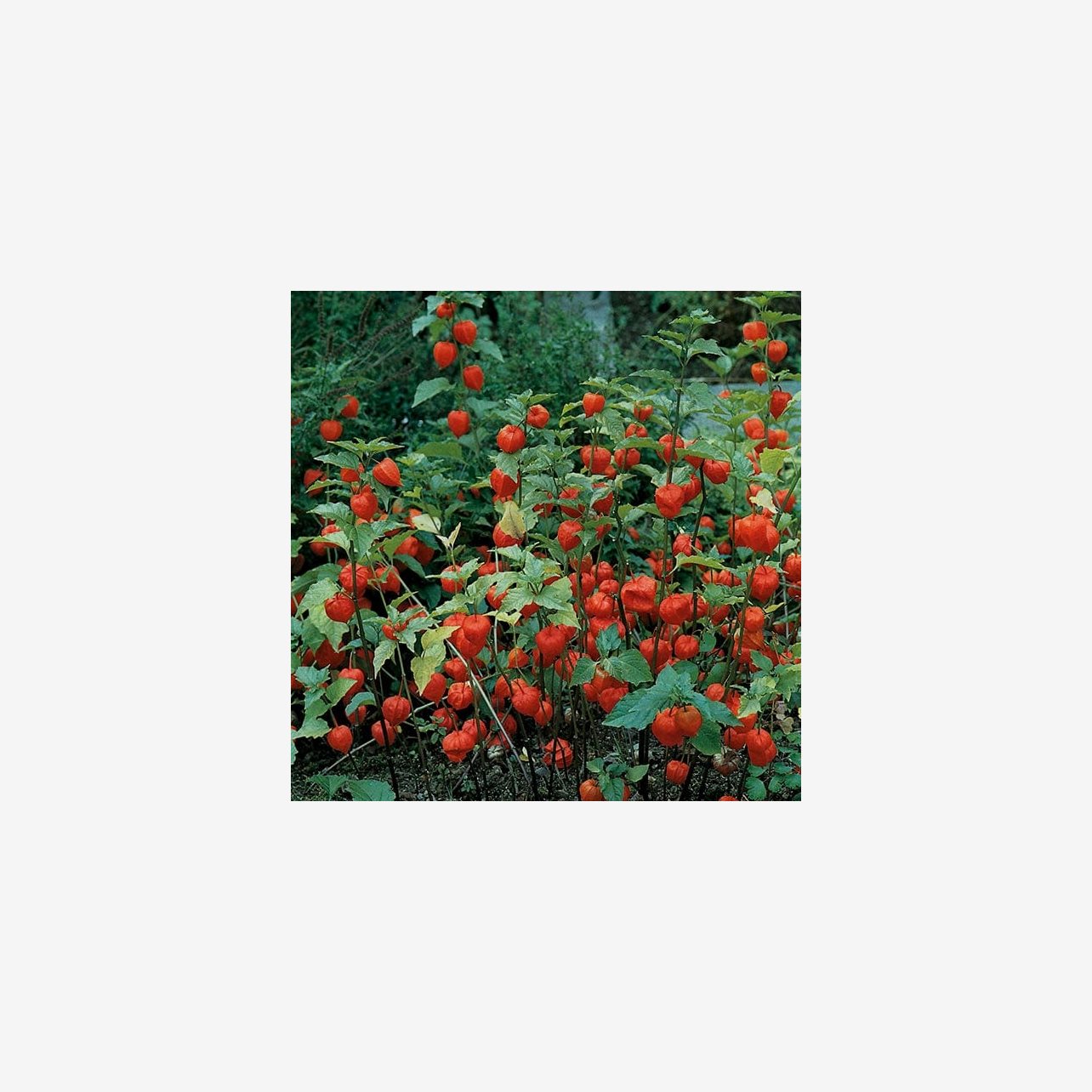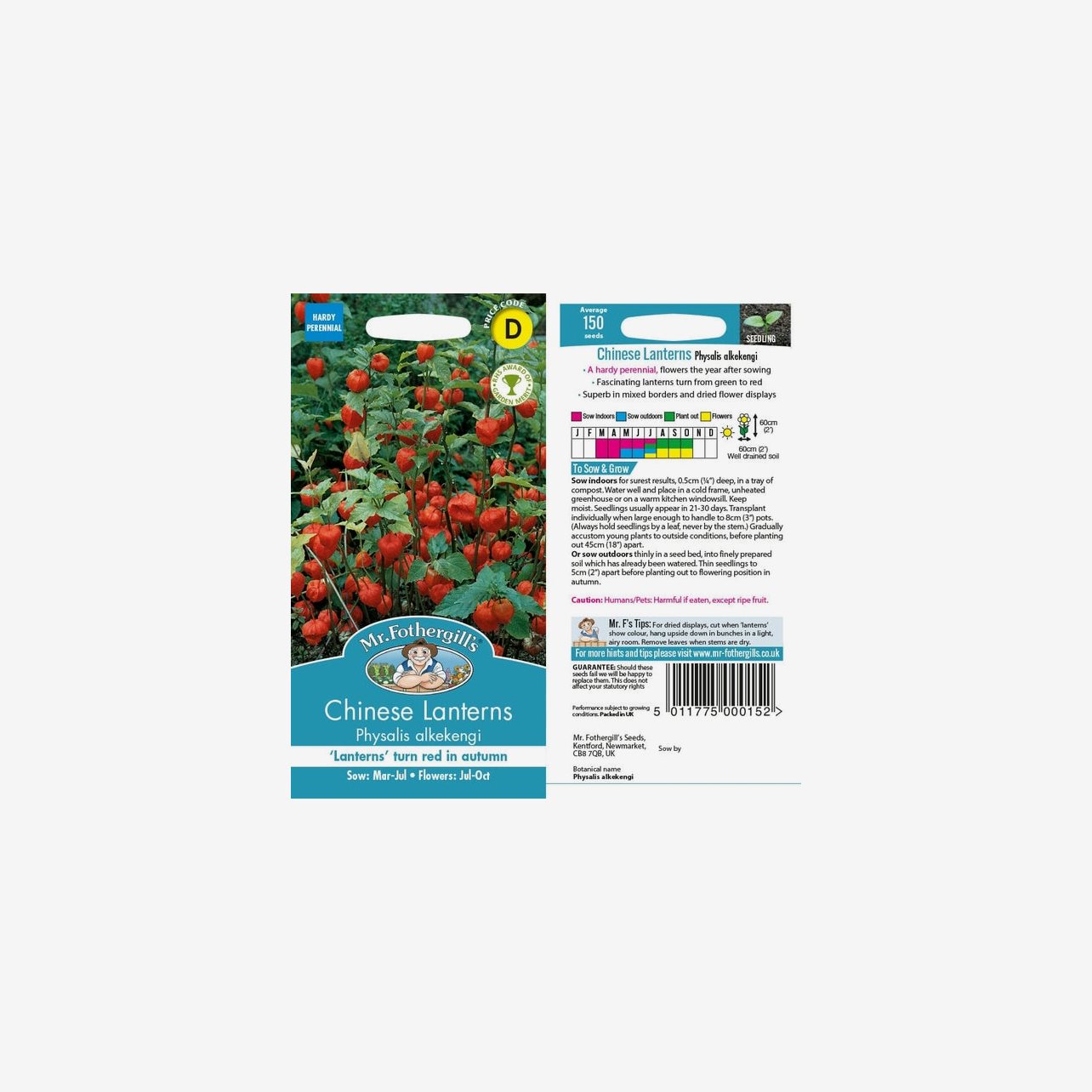 Fröpåsen innehåller cirka 150 fröer. Det latinska namnet är Physalis alkekengi och plantorna blir cirka 60–80 cm höga.