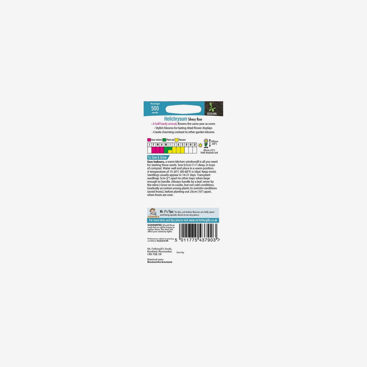 Fröpåsen innehåller cirka 500 fröer. Plantorna blir omkring 100 cm höga. Det latinska namnet är Helichrysum bracteatum. Blommorna är rosa med silvrig ton och uppskattas av bin och andra pollinatörer. Jätteeternell är en halvhärdig ettåring som blommar samma år som den sås.