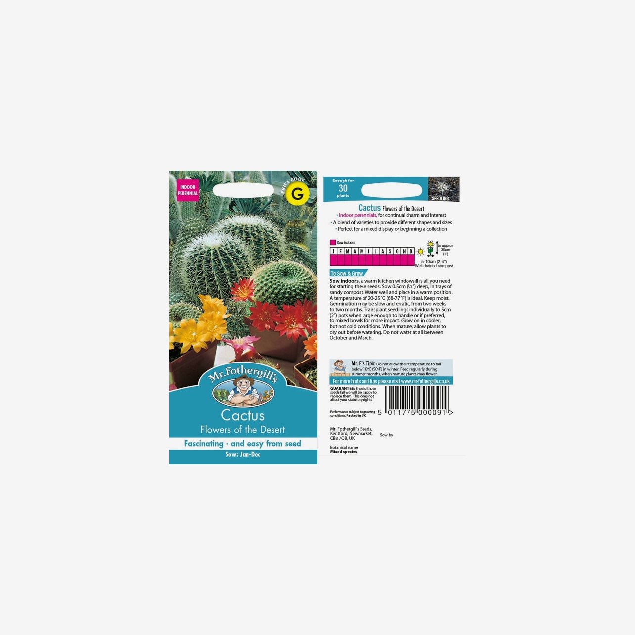 Fröpåsen innehåller cirka 30 fröer. Det latinska namnet varierar beroende på sort, men tillhör familjen Cactaceae. Höjden varierar mellan cirka 5–30 cm beroende på art och odlingsförhållanden.