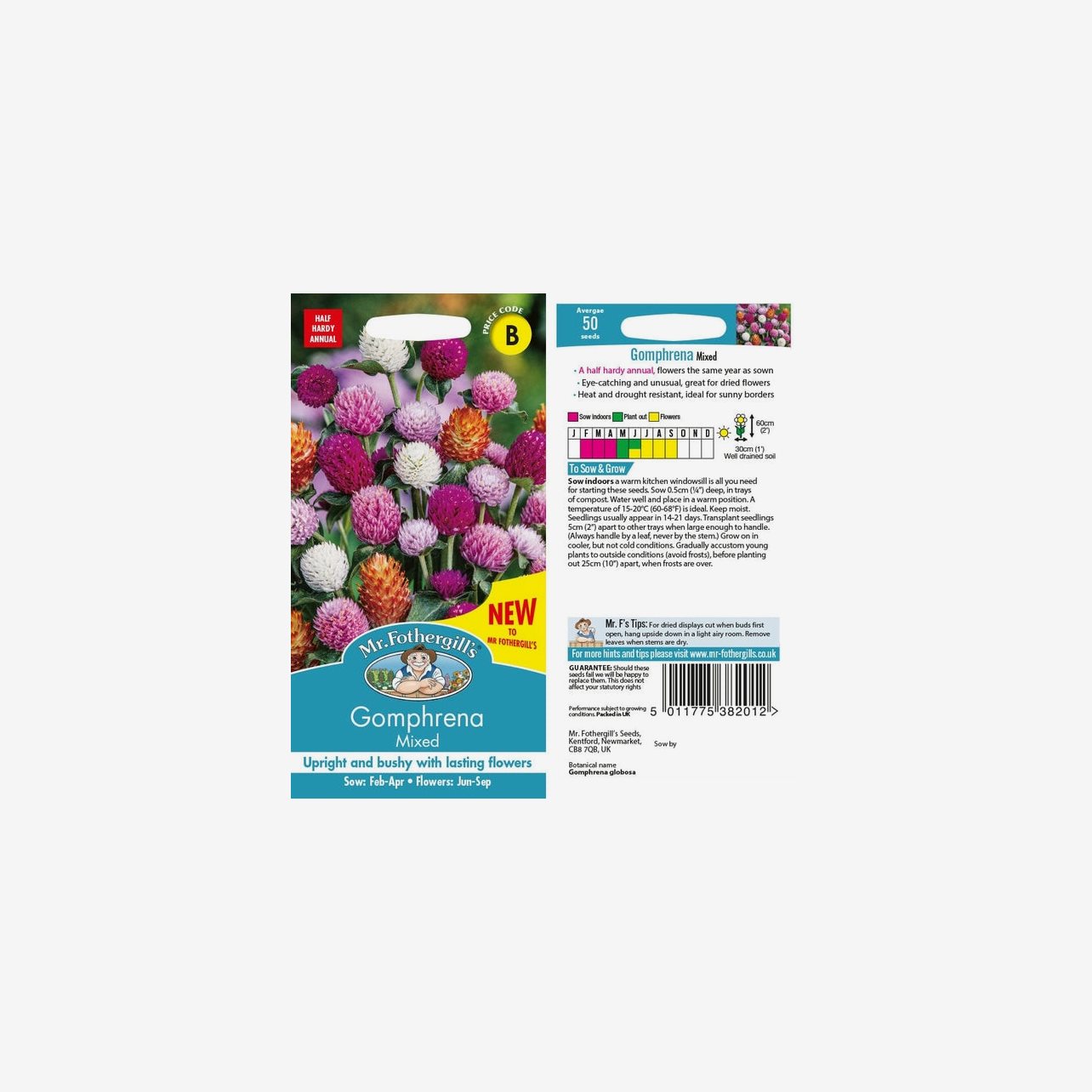 Fröpåsen innehåller cirka 0 fröer. Det latinska namnet är Gomphrena globosa och plantorna blir cirka 60 cm höga.