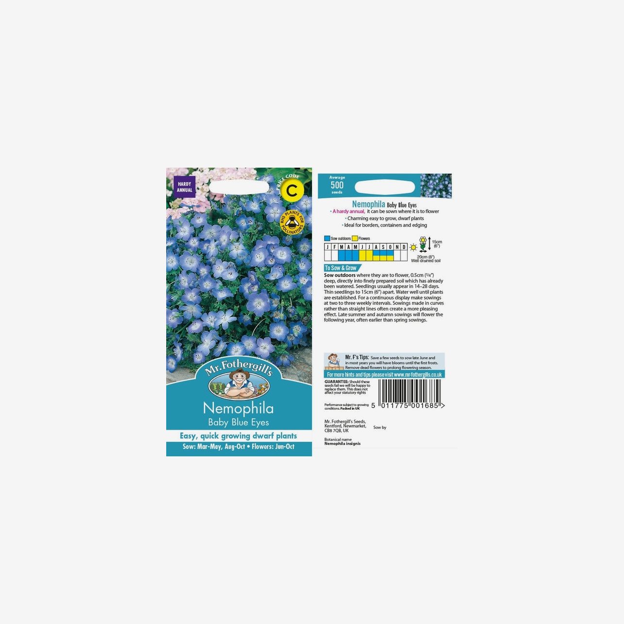 Fröpåsen innehåller cirka 500 fröer. Det latinska namnet är Nemophila insignis. Plantorna blir omkring 15 cm höga och har ett kompakt, marktäckande växtsätt. Blommorna är ljusblå med ljusare centrum.