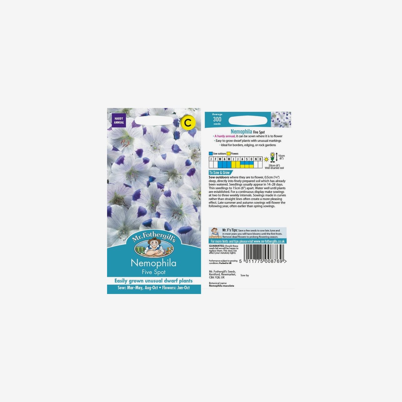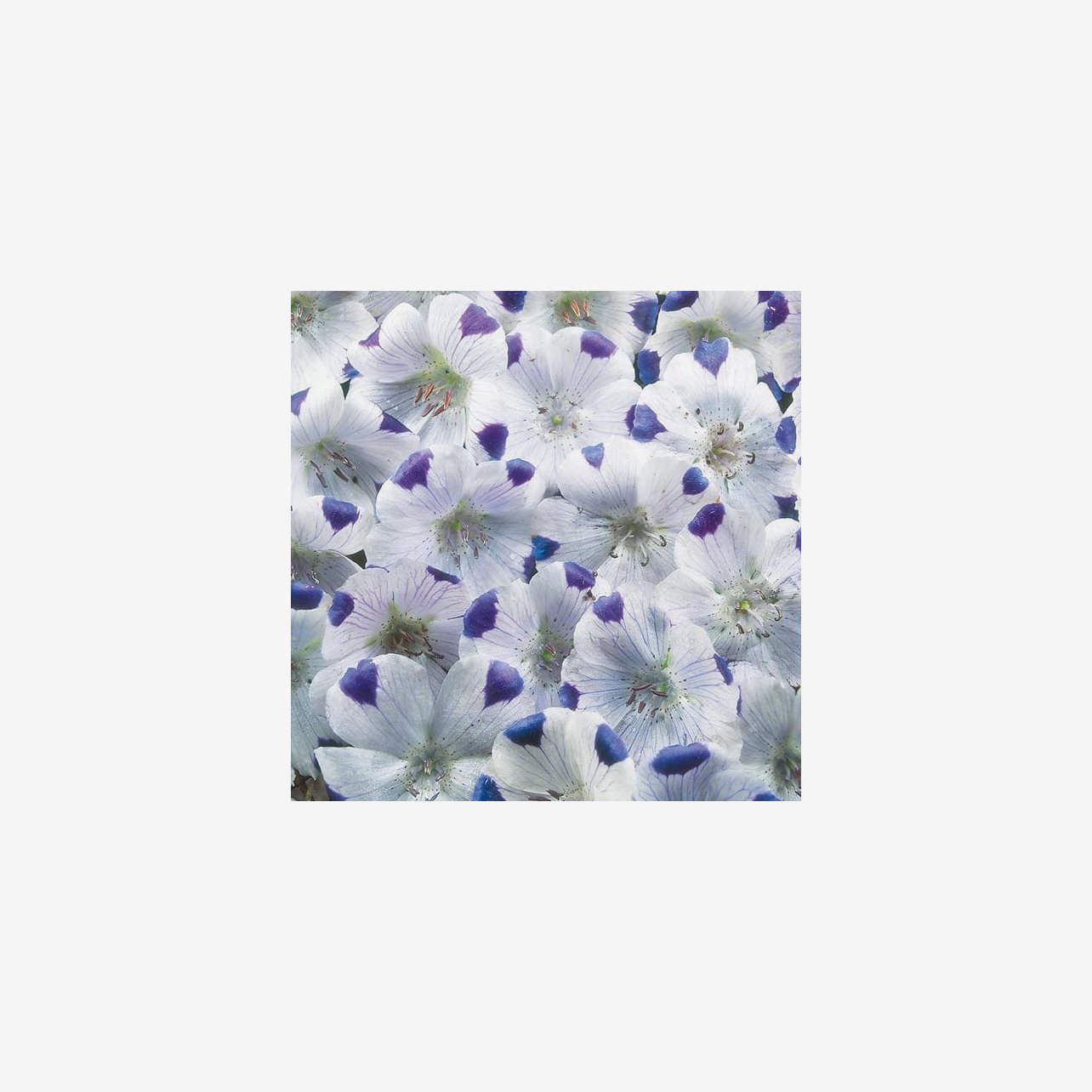 Fröpåsen innehåller cirka 300 fröer. Det latinska namnet är Nemophila maculata. Plantorna blir omkring 15 cm höga och bildar låga, buskiga bestånd. Blommorna är vita med blå markeringar på kronbladens ytterkanter.