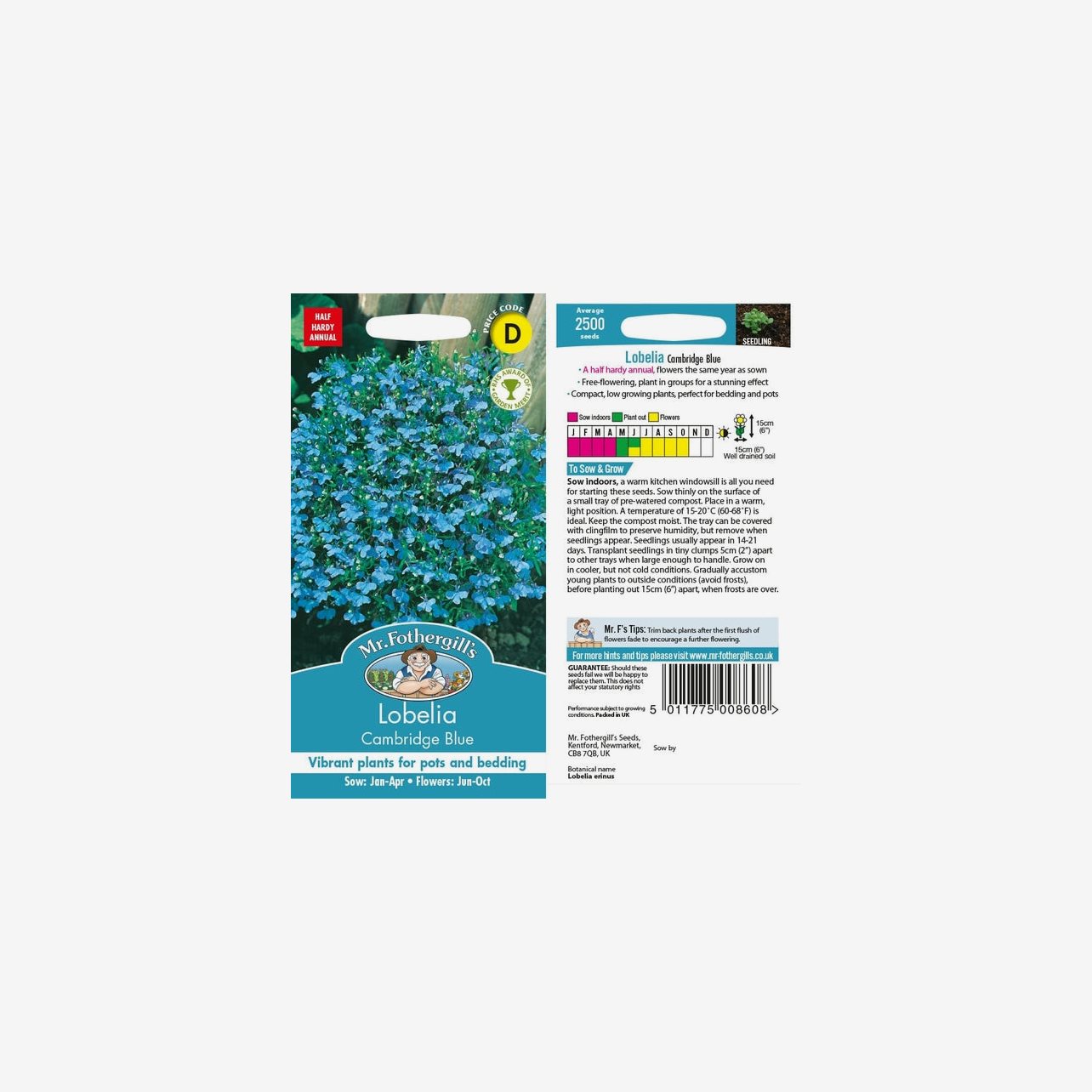 Odlingsanvisning: Lobelia Häng Cambridge Blue förodlas inomhus från januari till april. Så fröerna mycket ytligt på fuktad såjord i tråg, då fröerna inte ska täckas med jord. Placera ljust och varmt vid cirka 15–20 °C och håll jorden jämnt fuktig. Groning sker normalt inom 14–21 dagar. När plantorna är tillräckligt stora planteras de om i små tuvor med cirka 5 cm mellanrum och odlas vidare ljust men svalare. Avhärda plantorna successivt och plantera ut i väldränerad jord när frostrisken är över, vanligtvis under maj till juni, med cirka 15 cm mellanrum. Lobelia trivs bäst i halvskugga och blommar kontinuerligt under sommaren.