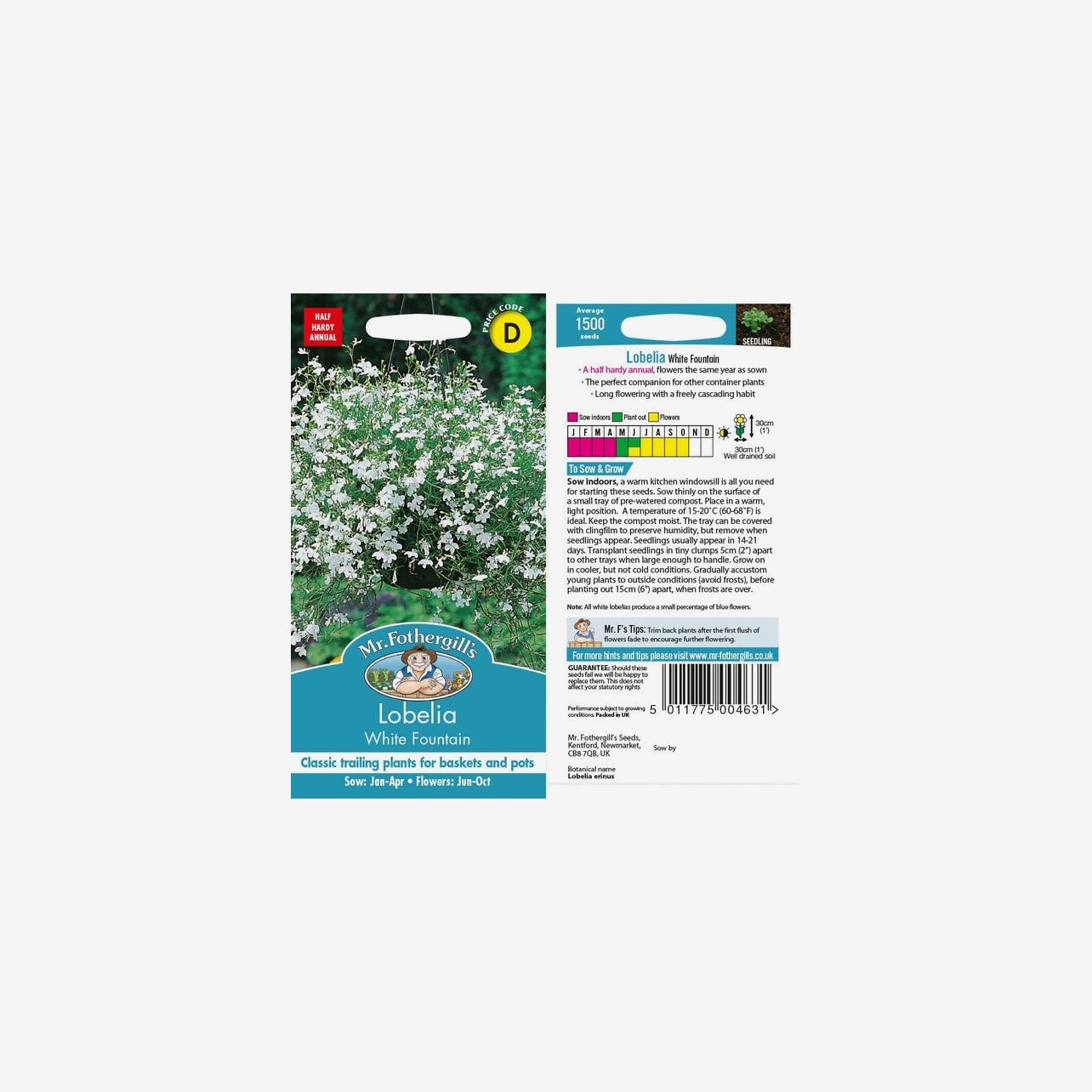 Odlingsanvisning: Lobelia Häng White Fountain förodlas inomhus från januari till april. Så fröerna mycket ytligt på fuktad såjord i tråg utan att täcka dem med jord. Placera ljust och varmt vid cirka 15–20 °C och håll jorden jämnt fuktig. Groning sker normalt inom 14–21 dagar. När plantorna är tillräckligt stora planteras de om i små tuvor med cirka 5 cm mellanrum och odlas vidare ljust men svalare. Avhärda plantorna successivt och plantera ut i väldränerad jord när frostrisken är över, vanligtvis under maj till juni, med cirka 15 cm mellanrum. Lobelia trivs bäst i halvskugga men klarar även soligare lägen med god vattentillgång och blommar kontinuerligt under sommaren.