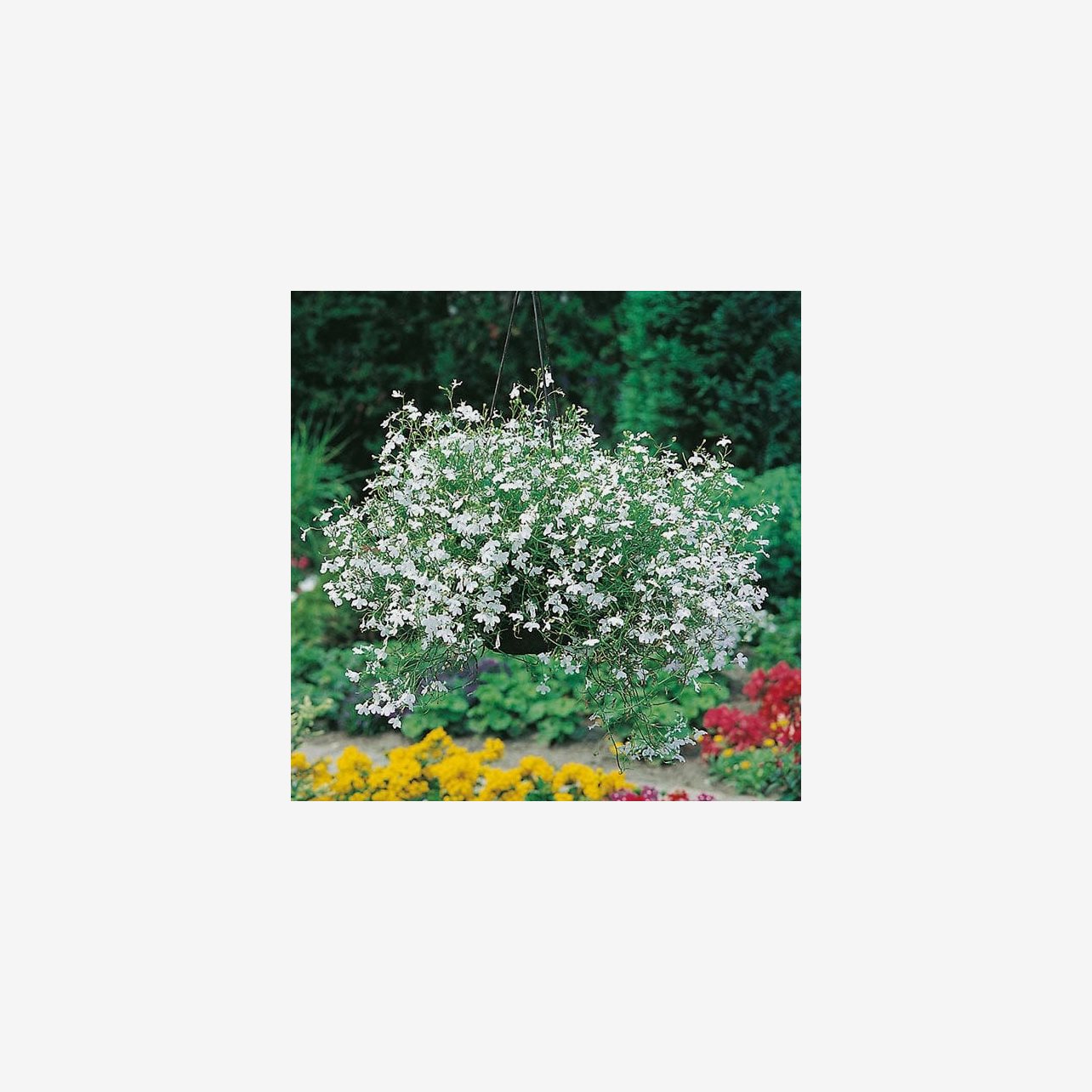 Fröpåsen innehåller cirka 1500 fröer. Det latinska namnet är Lobelia erinus. Plantorna blir omkring 30 cm höga och har ett tätt, hängande växtsätt. Blommorna är rent vita och sitter tätt längs de finförgrenade stjälkarna.