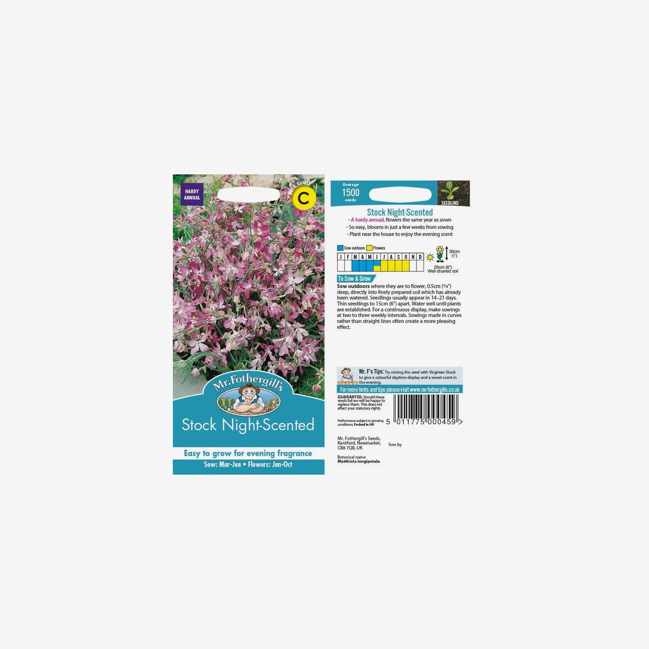 Fröpåsen innehåller cirka 1500 fröer. Det latinska namnet är Matthiola longipetala. Plantorna blir omkring 30 cm höga och har ett lågt, buskigt växtsätt. Blommorna är små och förekommer i mjuka nyanser av rosa, lila och vitt, med fokus på doft snarare än färgprakt.